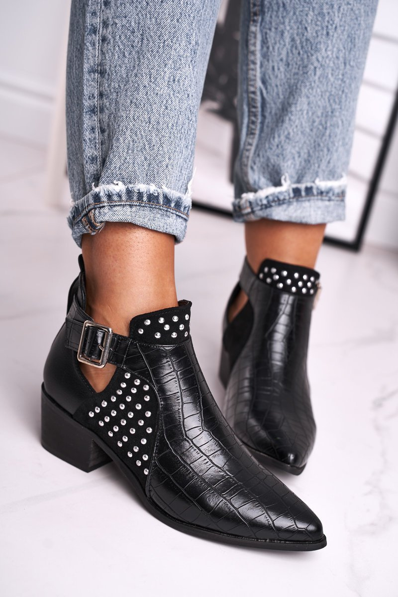 Black boots in a classic version with a pointed toe. They have indentations on the side of the upper and a buckle, which will make it easier to put them on. Set on a low heel that will emphasize your figure. When choosing a size, please suggest a size chart.