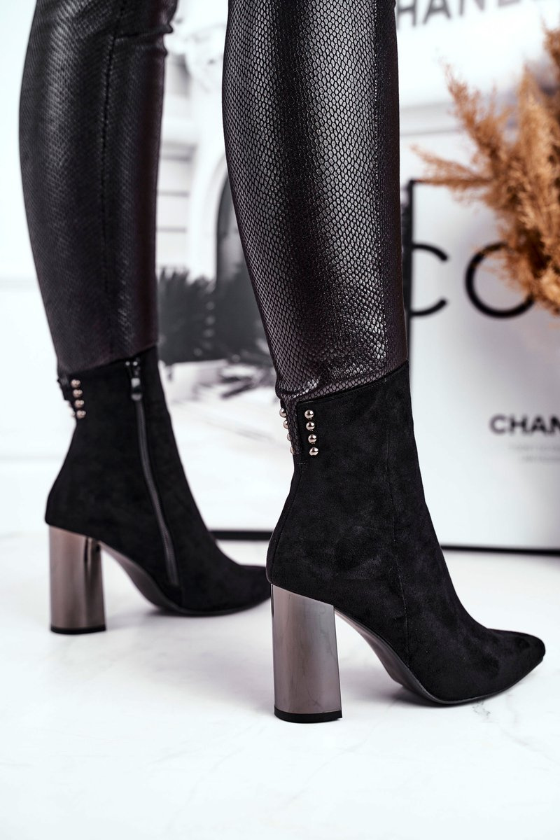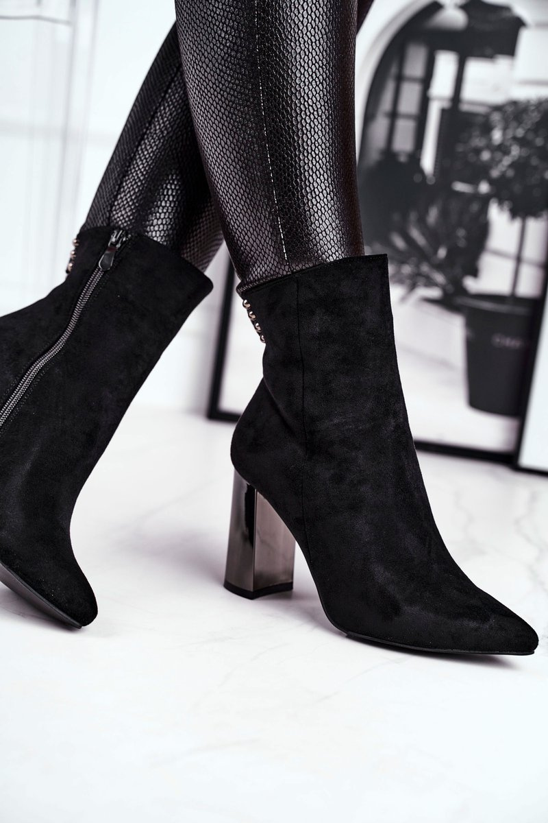 Black boots made of eco-suede pleasant to the touch and with a mirror heel are our novelty. A stable post and opening with a zipper will ensure comfort of use. The fly in the upper adjusts to any width, making it an excellent choice for autumn or spring use. When choosing a size, please use the size chart.