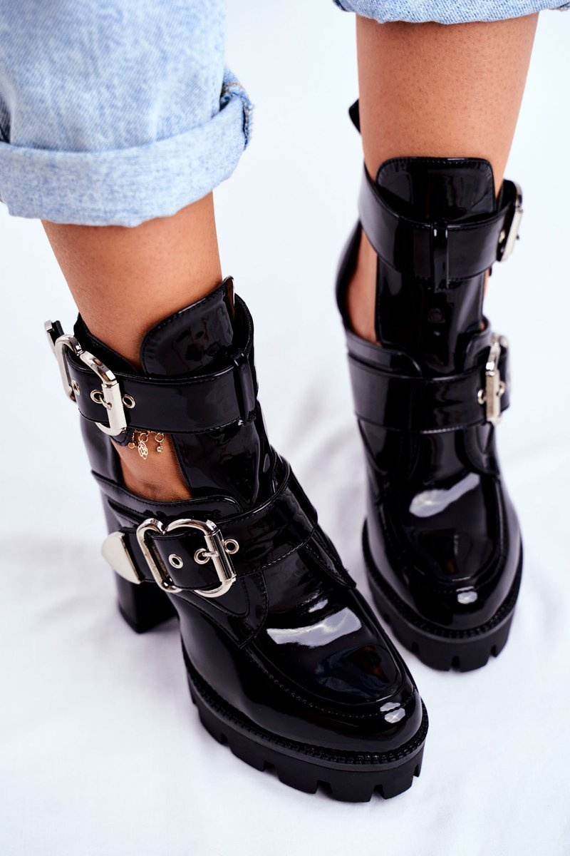 Exclusive women's boots in a slightly stronger version! Fastening with two large silver buckles, a tall post and a 3.5 cm platform, and all this in a beautiful lacquered black color <3 Get yourself a little extraordinary look and show everyone who rules here! When choosing a size, please suggest a size chart.