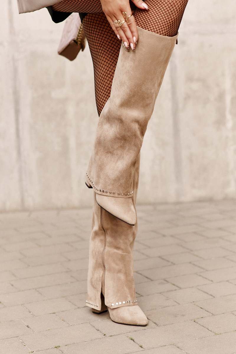 Women's knee-high boots with a loose shaft made of eco suede. Set on a stable block heel, with pointed toes that add a sophisticated character. The interior is lined with warm shoe fleece, providing warmth on cooler days. The folded shaft that smoothly transitions into the heel is a unique feature of this model. Fastened with a zipper, they pair perfectly with dresses and skirts, adding elegance to any outfit. When choosing a size, please refer to the size chart.