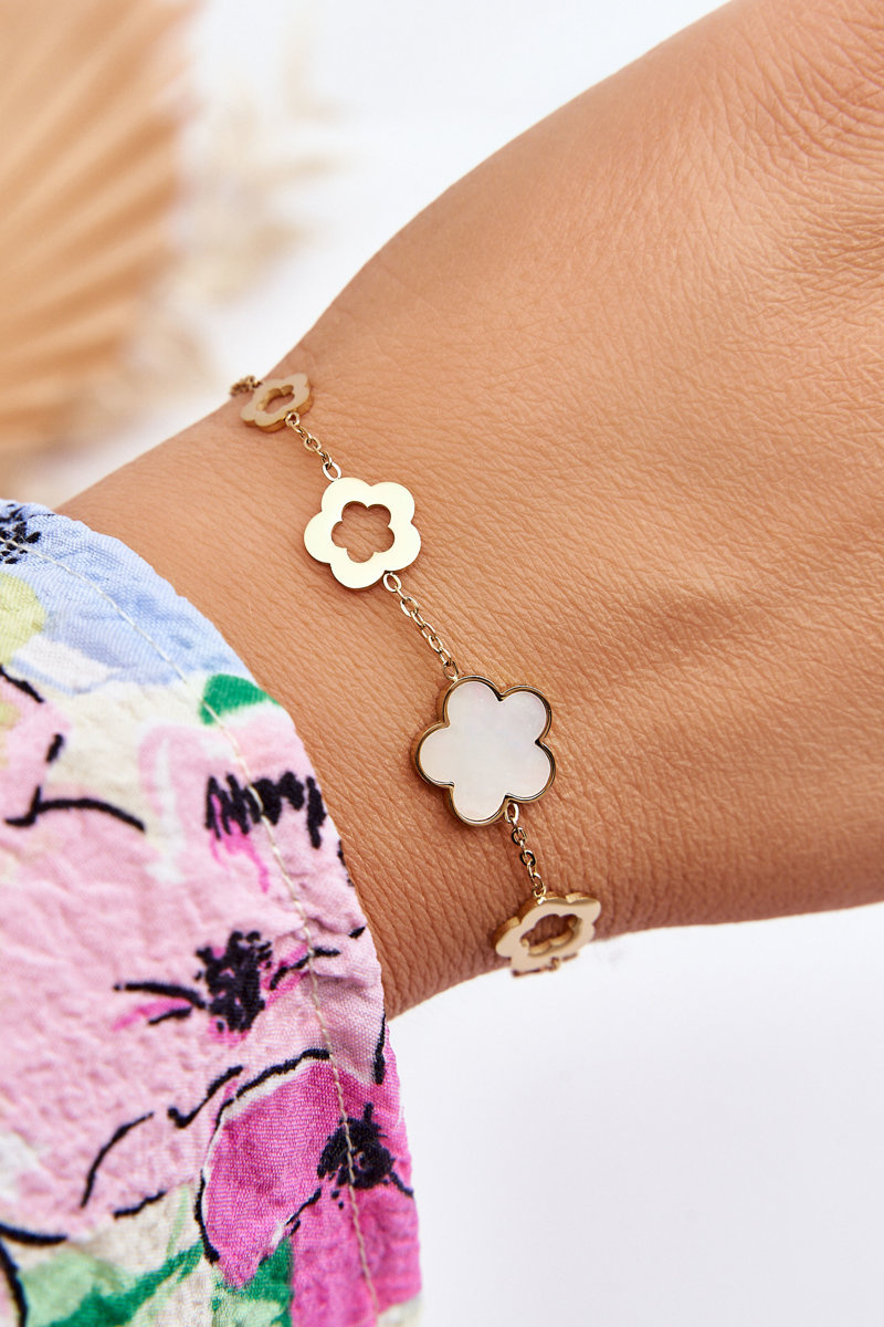 The classic bracelet on a thin chain is made of stainless steel. This model has pendants in the shape of flowers. The bracelet is adjustable in length and fastened with a lobster clasp. Perfect for everyday styling.