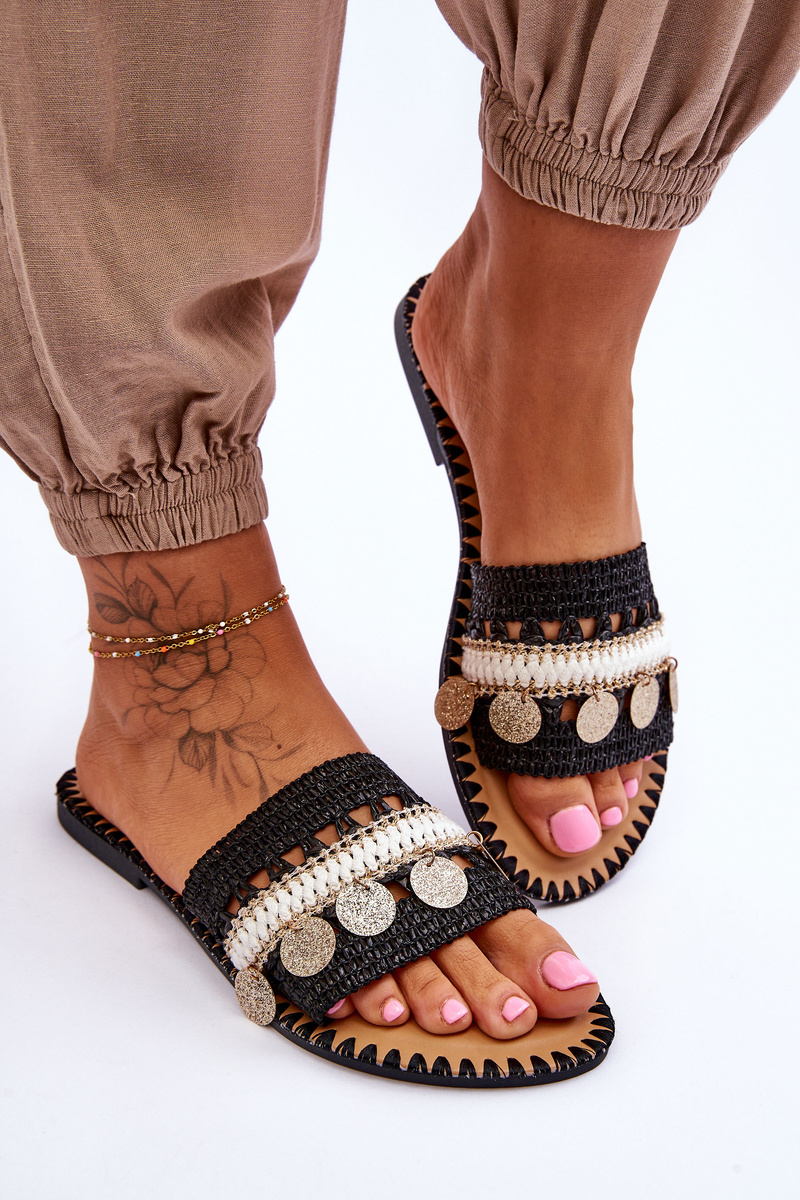 Fashionable, women's slippers are made of a combination of plastic and fabric. This model has decorative circles and lurex, i.e. a shiny thread. Classic slip-on model, with a flat heel and non-slip sole. The eco-leather insert has also been decorated with thread. When choosing a size, please refer to the size chart.