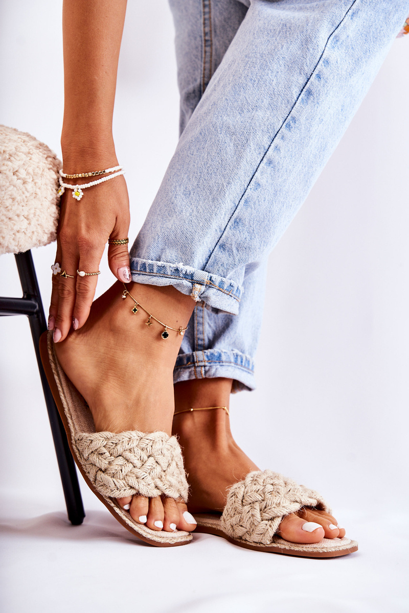The unique women's slippers are made of a fabric upper. The braided strap on the front makes these flip-flops great for boho styling. The soft insole is made of fabric. There is a decorative braid around it. The shoes have an open toe cap. The slippers have a non-slip sole. Fashionable and comfortable to use - you just have to have these flip-flops! When choosing a size, please use the size chart.