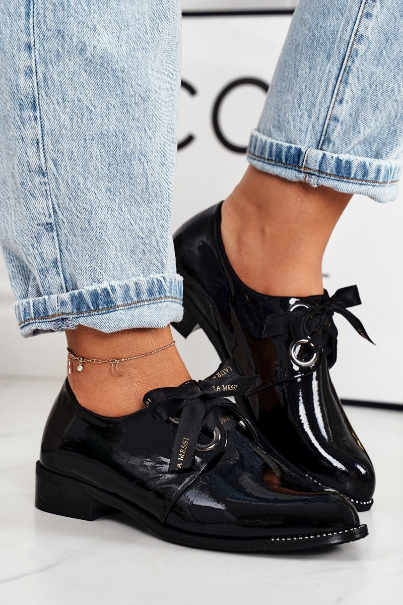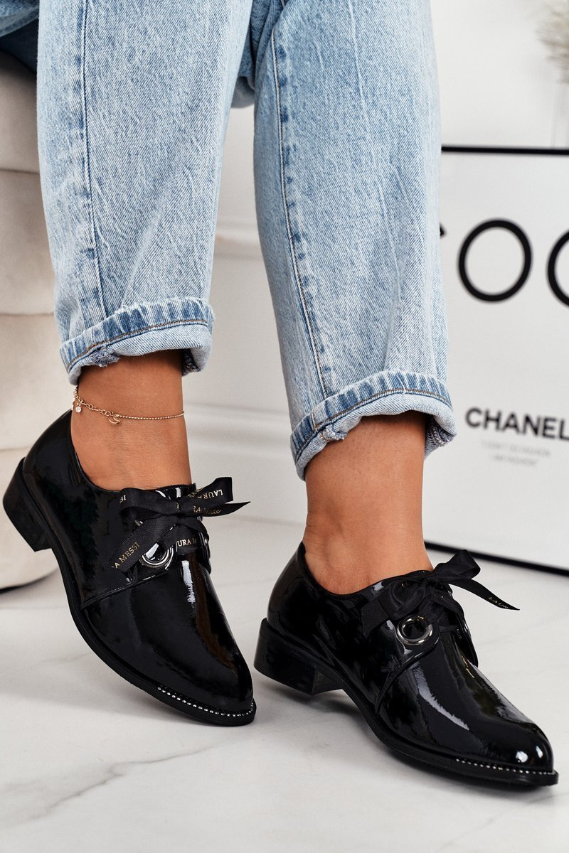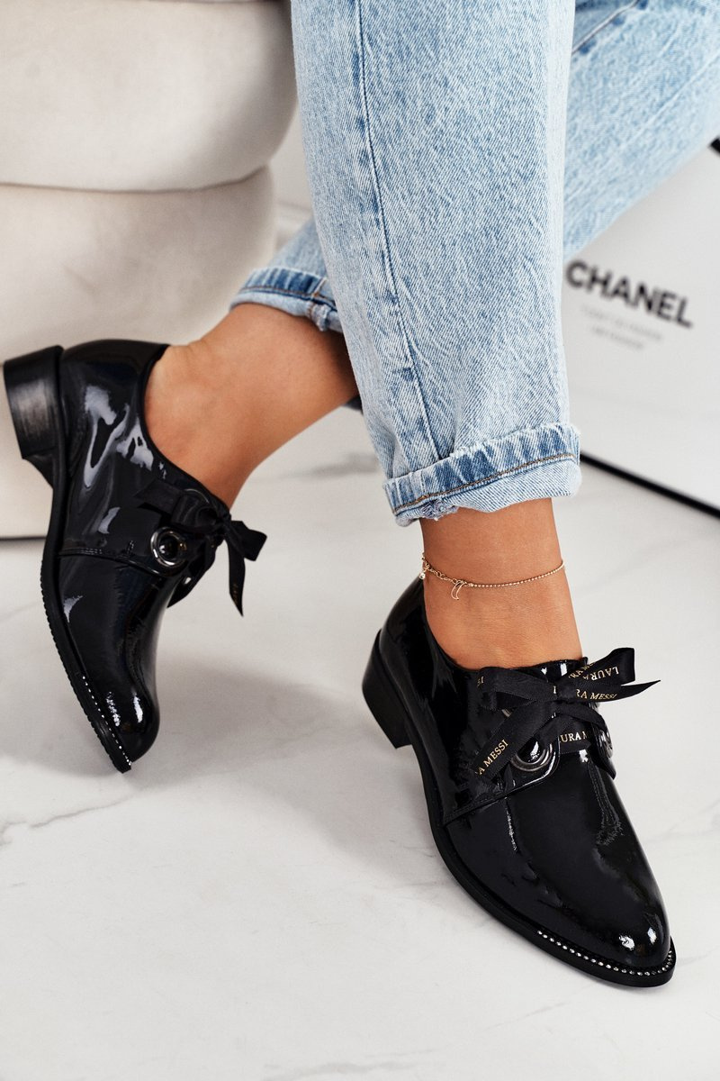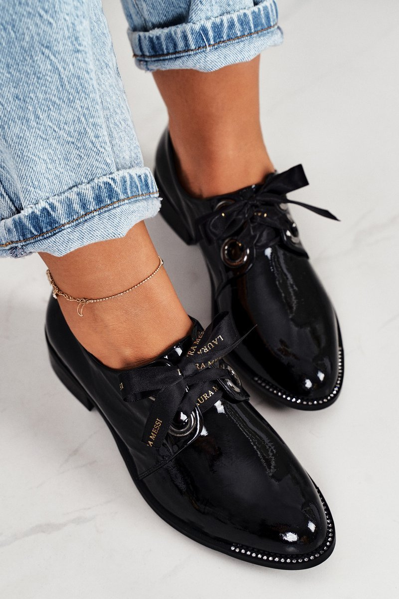 Elegant, women's LAURA MESSI shoes. The shoes are made of patent leather with attention to every detail. The shoes are unique thanks to decorative sequins on the sole and a logged ribbon. A soft, leather insole will take care of your comfort. Be sure to check out our entire collection of LAURA MESSI shoes. When choosing a size, please use the size chart.