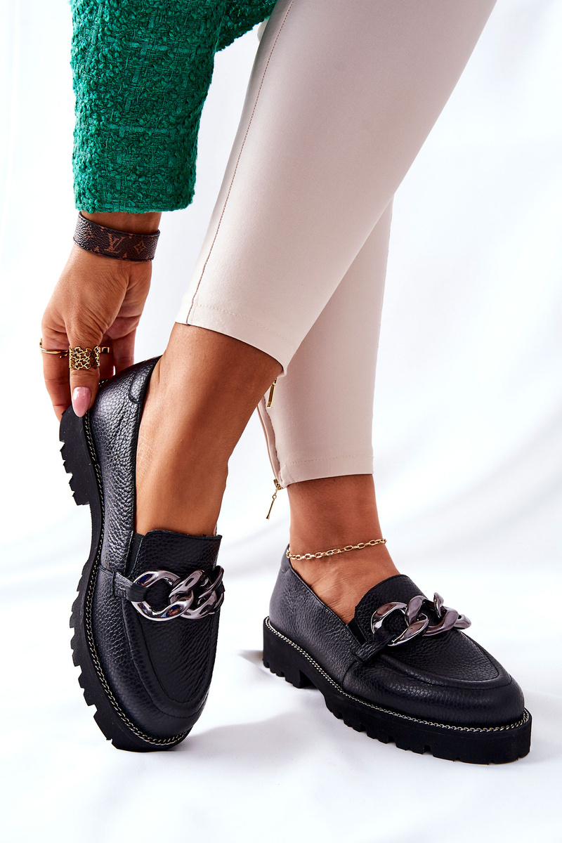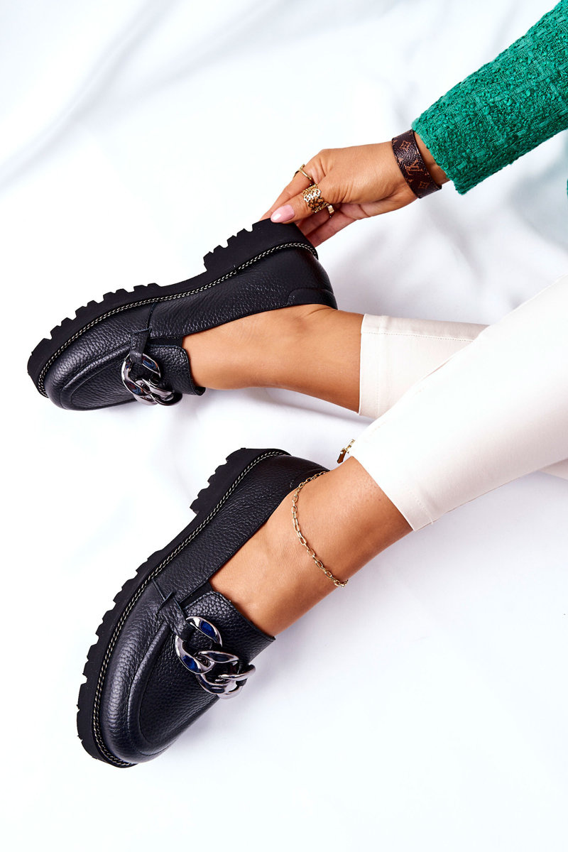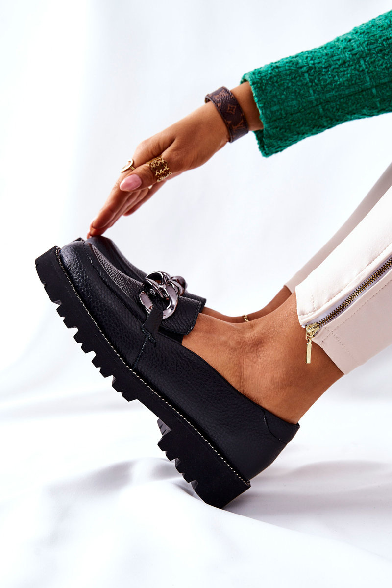 Classic half shoes in the style of beautiful loafers! The shoes are made of high quality natural leather. Characteristic decoration in a form of a chain will create many wonderful stylizations. High sole and heel which will lift our silhouette. When choosing the size, please refer to the size chart.