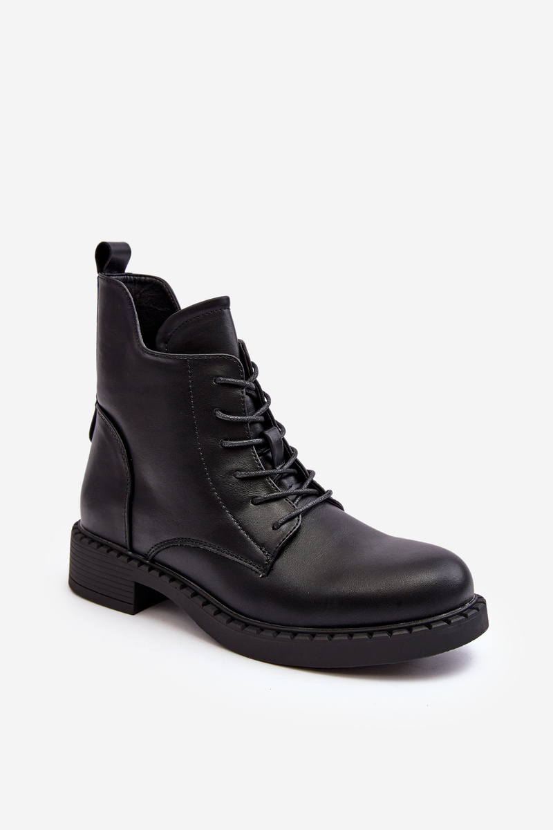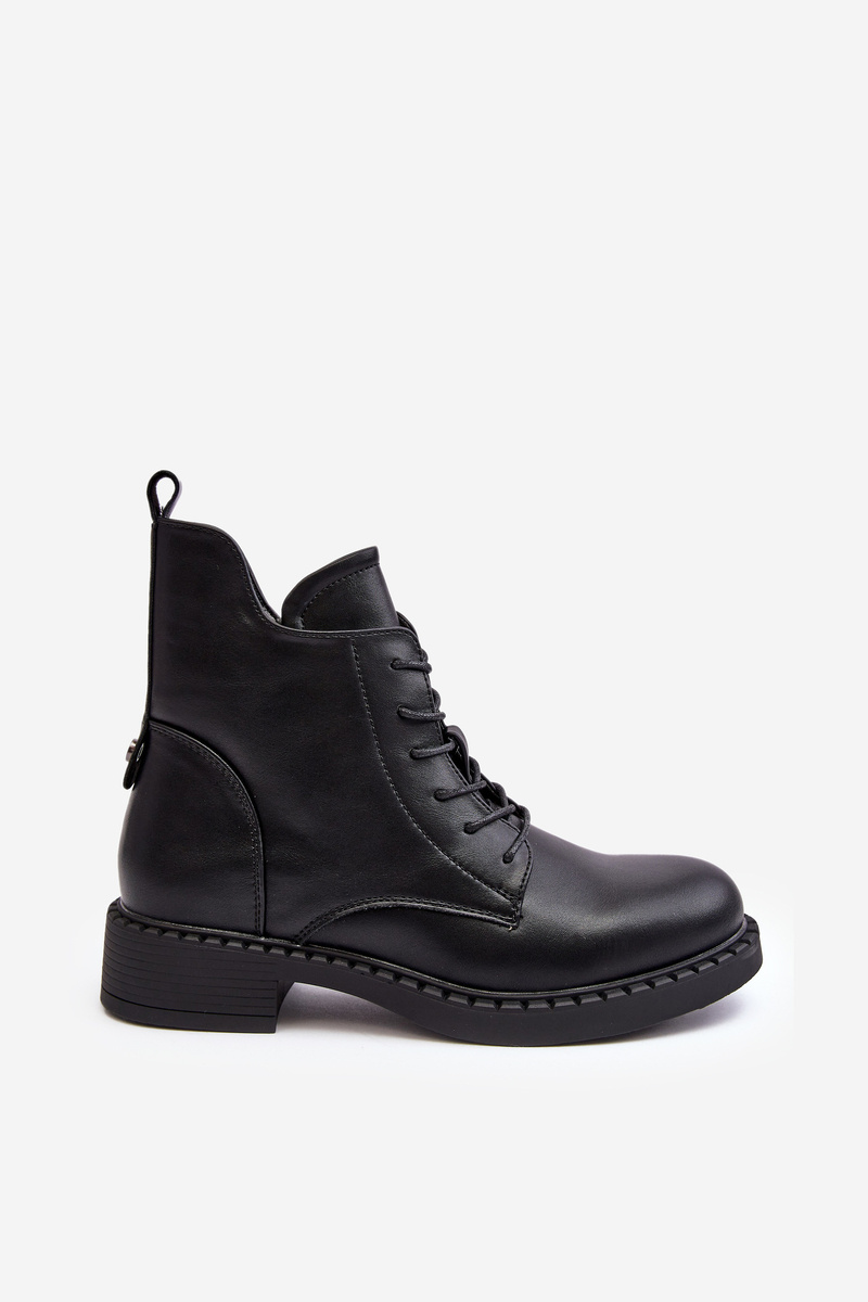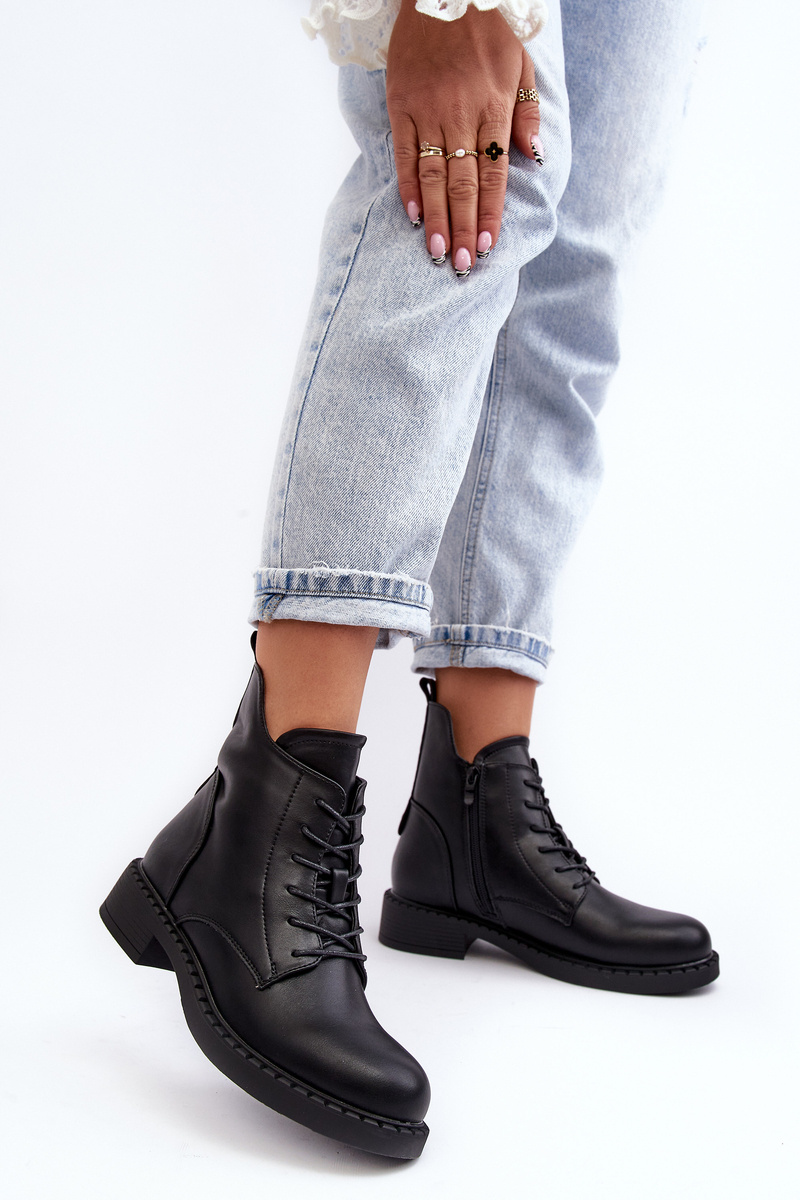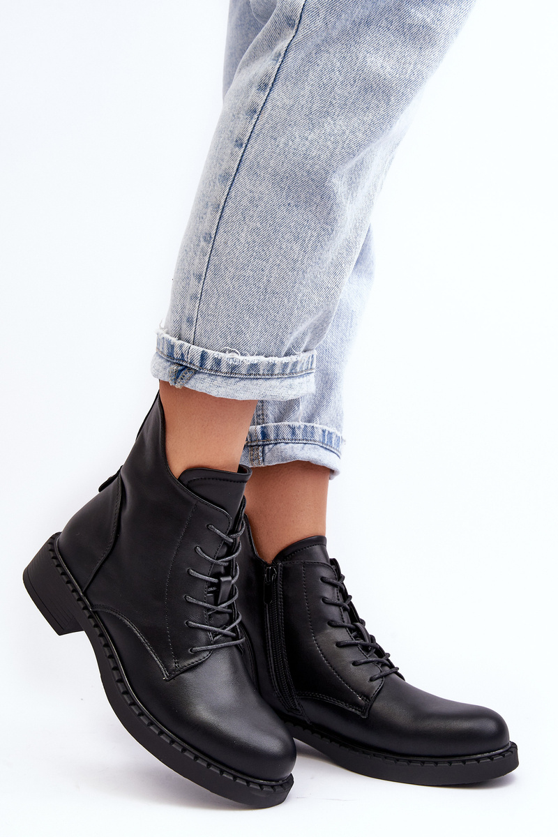 Classic women's ankle boots on a flat, stable heel. Made of eco leather, set on a flat heel. Upper with a zipper and lacing at the ankle. Rounded toes. The interior is lined with a pleasant to the touch shoe lining. You can match this model to many autumn-winter looks! You must have them! When choosing a size, please refer to the size chart.