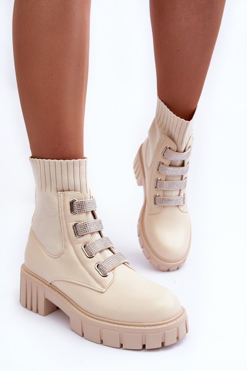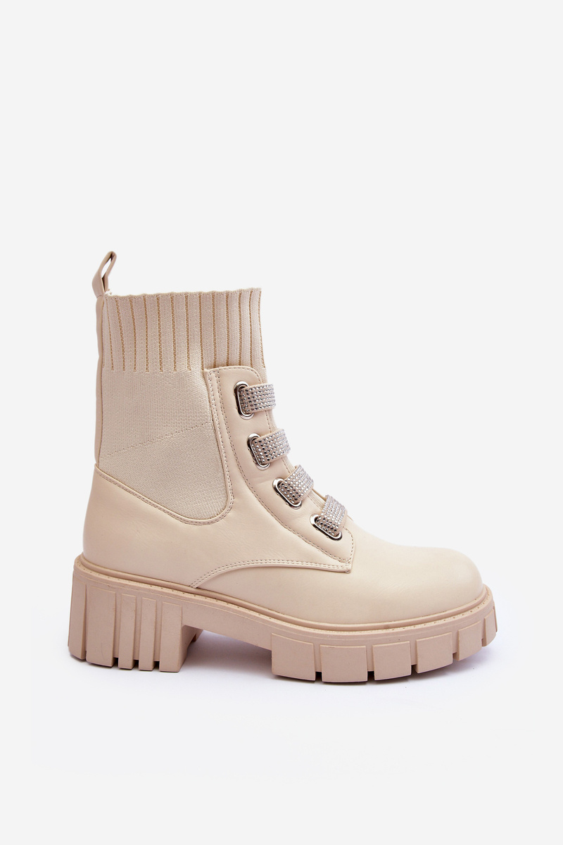 Women's ankle boots set on a flat heel and platform. Made of a combination of eco leather and fabric. On the front there are decorated with small rhinestones straps. Slip-on model with an elastic sock-like upper. Footbed lined with fur for warmth. Perfect for fall outfits! When choosing a size, please refer to the size chart.