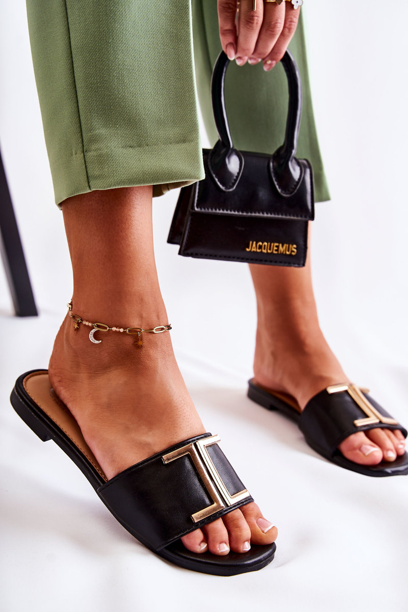Classic women's flat-heeled sandals are the perfect everyday model! Made of eco leather. Slip-on model with an exposed nose. There is a decorative emblem on the front. The sole is made of non-slip rubber material. The insole is made of eco leather for comfort during use. Great model, perfect for many styles! You absolutely should have them! When choosing a size, please use the size chart.