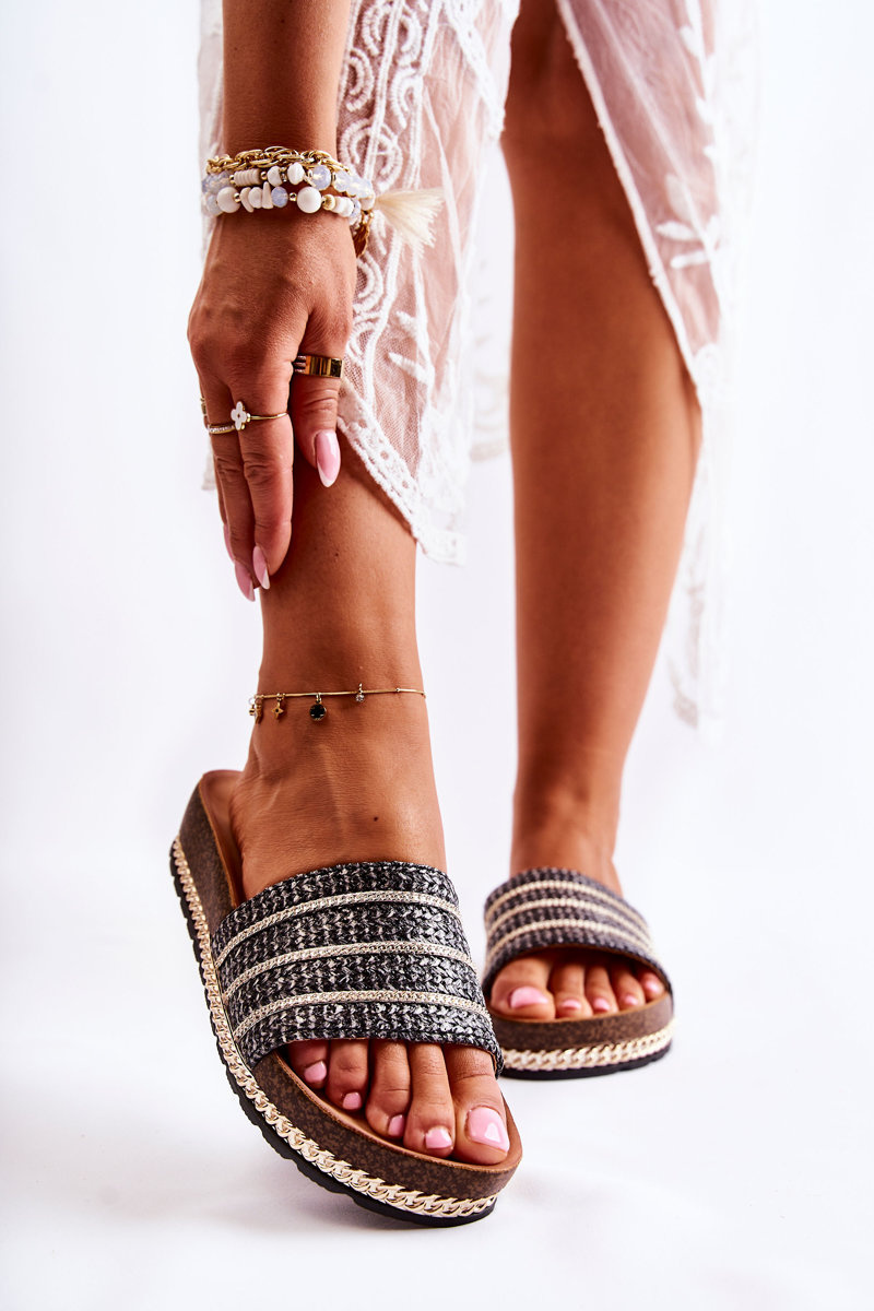 Women's slippers made of plastic in the form of braids. They have decorative chains on the front and around the sole. Classic, slip-on model. Comfort insole made of eco leather. The flaps are mounted on the platform. Plastic sole. The nose is open, rounded. The perfect everyday model! These shoes will be perfect for walking, shopping or even home instead of slippers. When choosing a size, please follow the size chart.