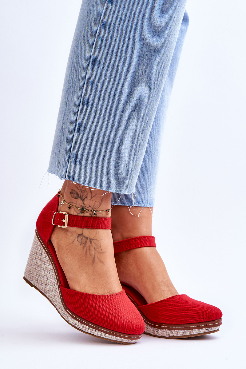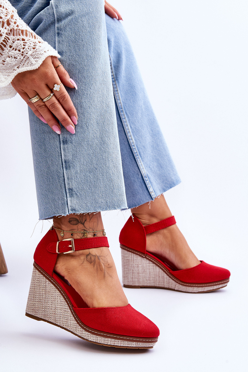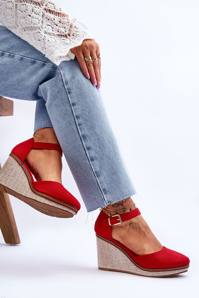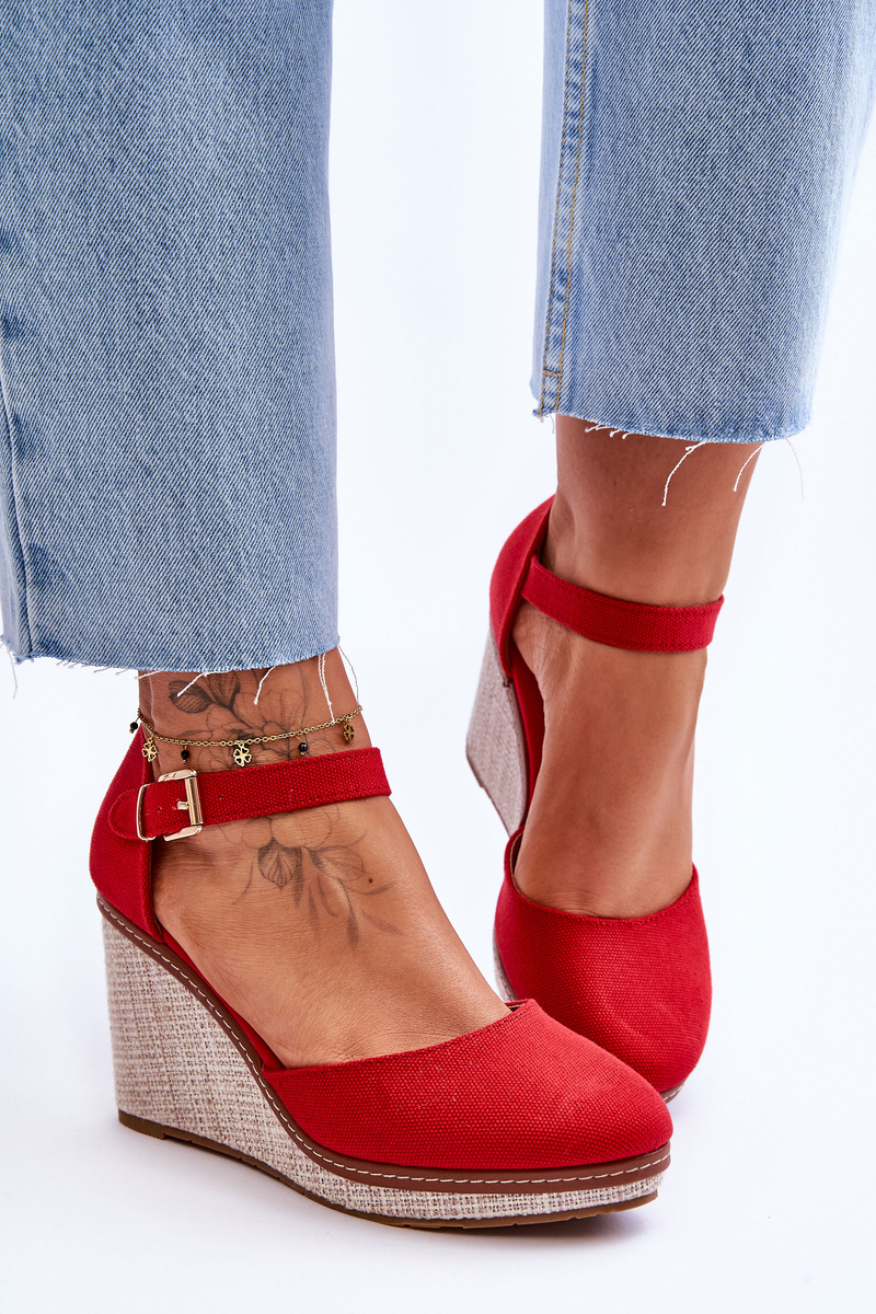 Classic, women's sandals are set on a wedge and platform. They were decorated with fabric. The insert and the top are made of fabric. The sandals have a stiffened heel counter and are fastened with an adjustable strap with a buckle. The perfect model for warmer days. You absolutely should have them! When choosing a size, please refer to the size chart.