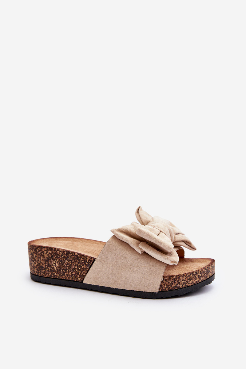 Women's sandals on a cork platform. The shoes have a lightly profiled insole that will guarantee comfort during use. The upper is made of pleasant to the touch eco suede. Lovely bow on the front. This model is perfect for everyday wear, for work or for shopping. Perfect for hot days! You definitely should have them! When choosing a size, please refer to the size chart.