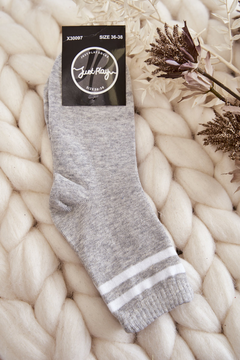 Women's sports socks are made of 100% cotton. The ankle-length model has two stripes on the top of the sock. The welt will fit perfectly to the width of the leg. Perfect for many types of shoes. First of all, they will look great in combination with sports shoes or sneakers.