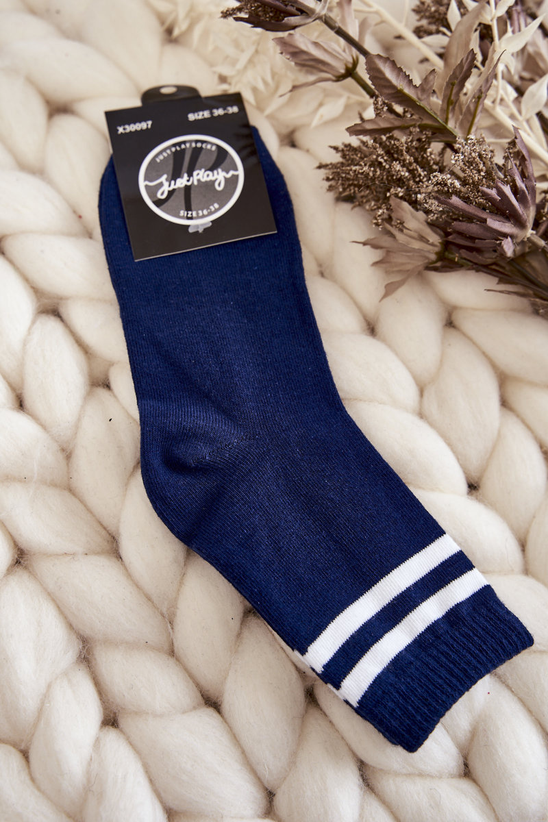 Women's sports socks are made of 100% cotton. The ankle-length model has two stripes on the top of the sock. The welt will fit perfectly to the width of the leg. Perfect for many types of shoes. First of all, they will look great in combination with sports shoes or sneakers.