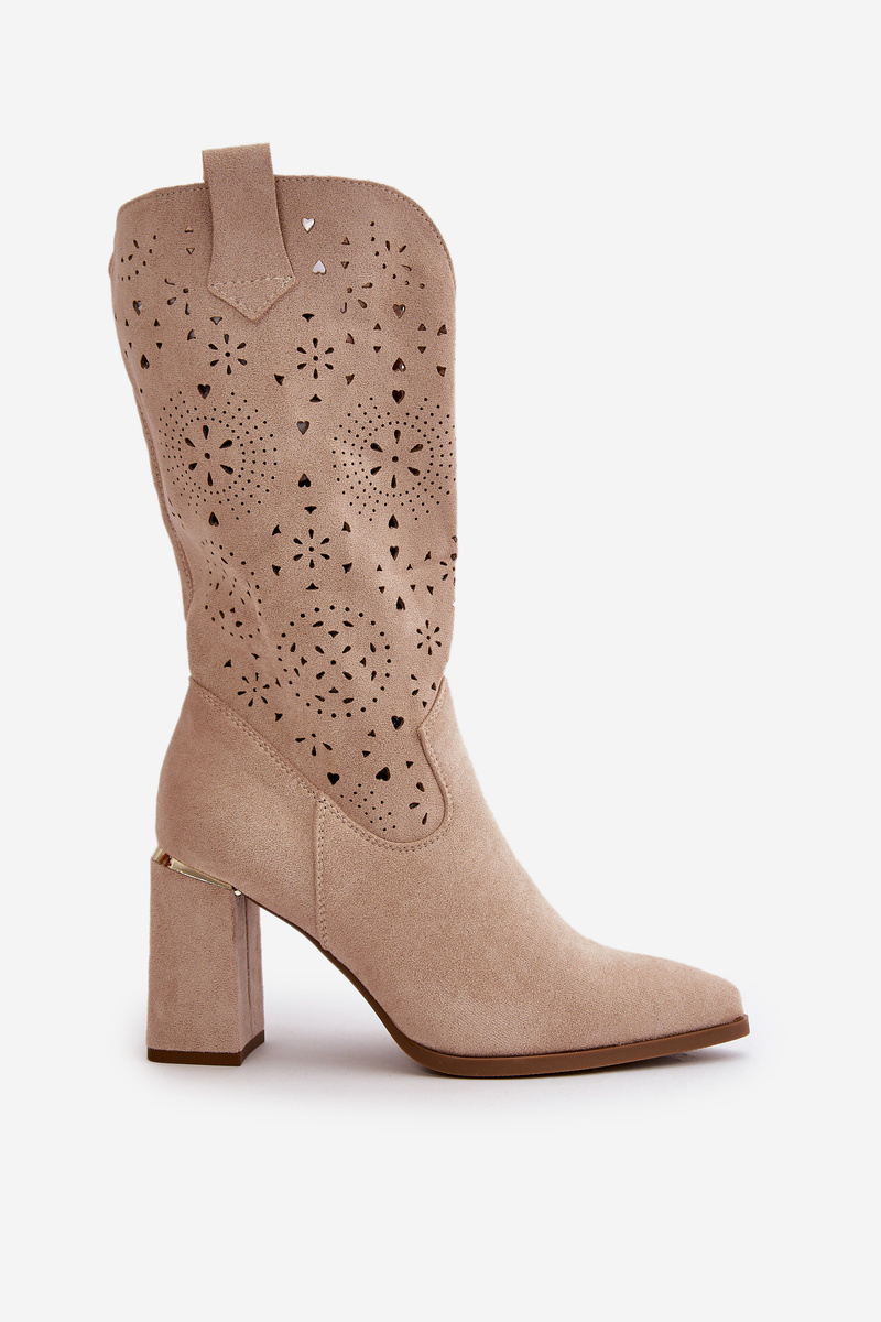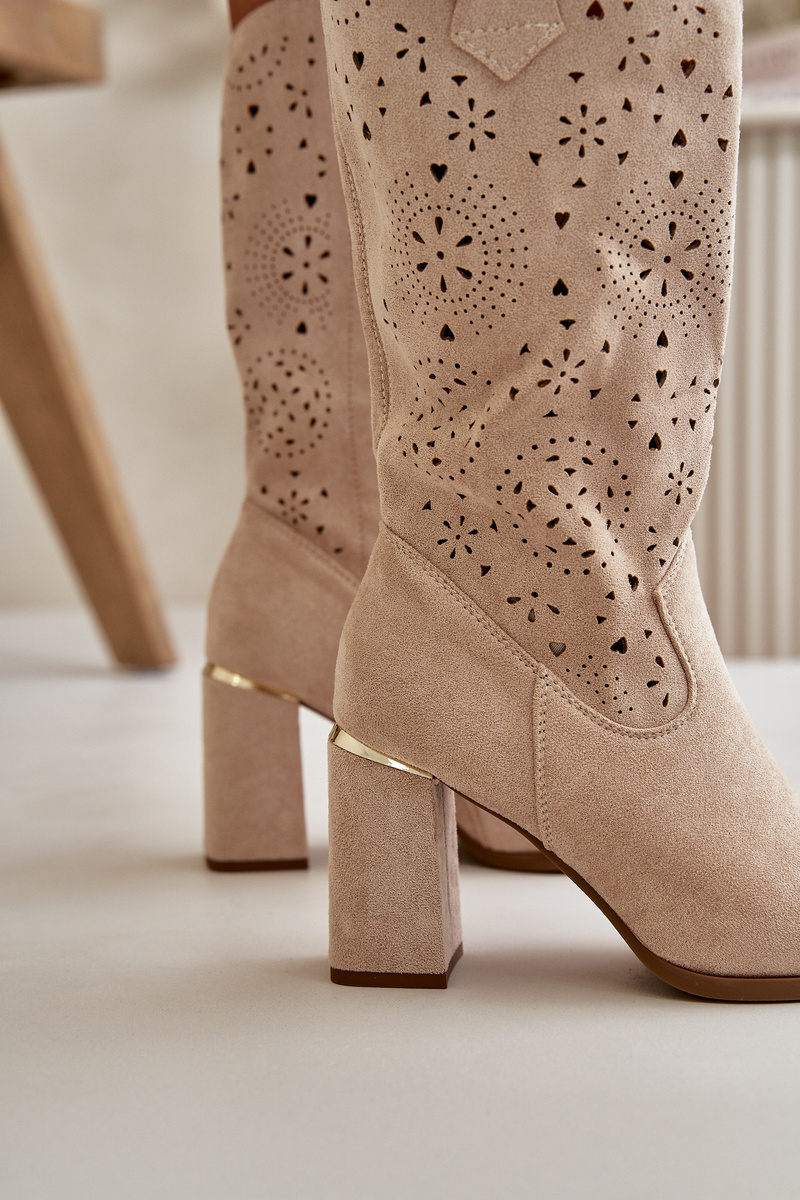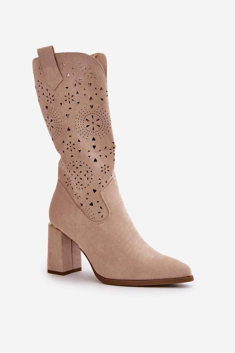 Women's ankle boots made of soft-touch eco suede. They have a latticed upper reaching to mid-calf. Set on a column heel with a mirrored accent. Fastened with a zipper, with pointed toes. This fashionable and elegant style will be the perfect complement to many outfits! When choosing a size, please refer to the size chart.