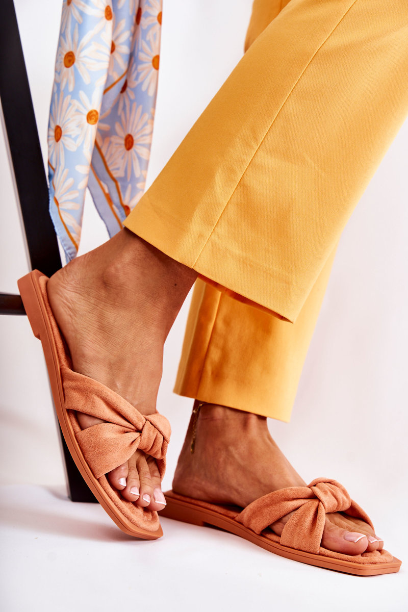 Classic women's slippers are made of eco suede pleasant to the touch. The stripes of the flaps connect at the front to form a knot. The insole is quilted and also made of eco suede. Slippers set on a flat heel. A model that will be perfect for everyday activities, e.g. while shopping or walking. These slippers have an open, square toe. When choosing a size, please use the size chart.