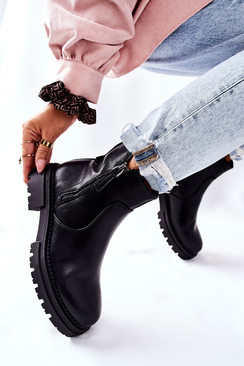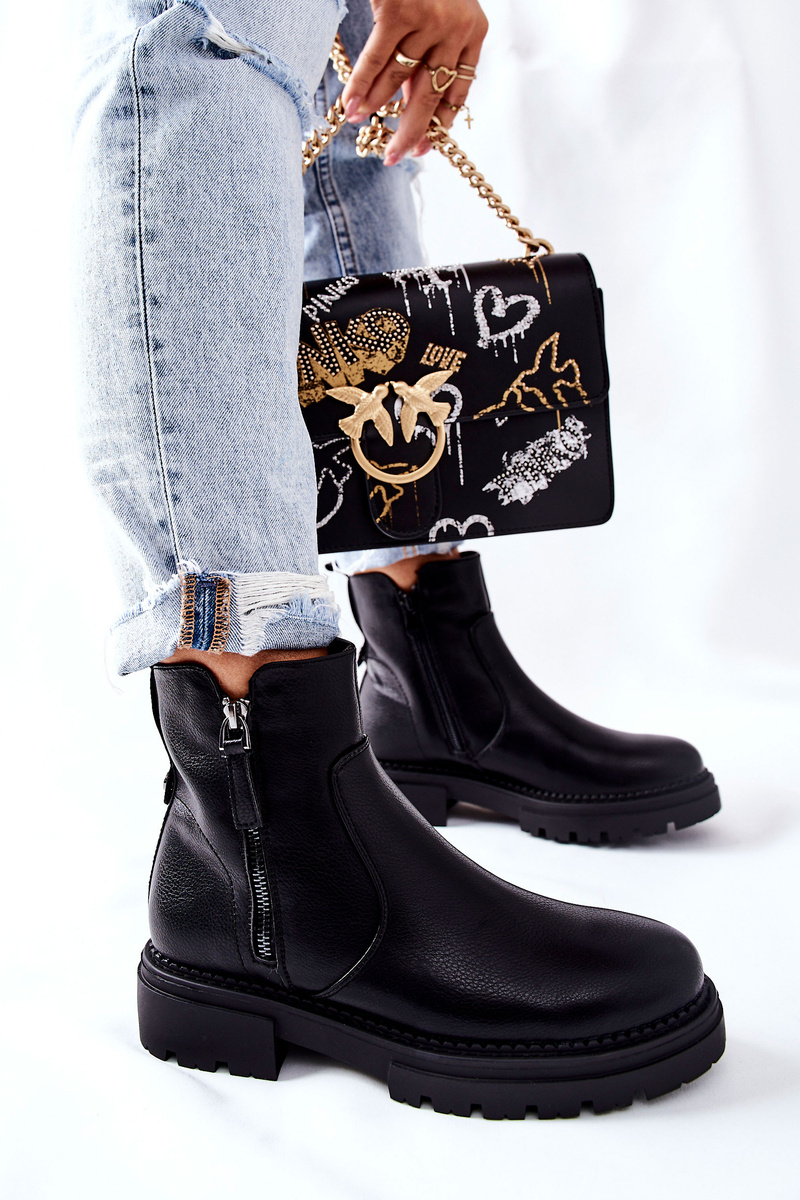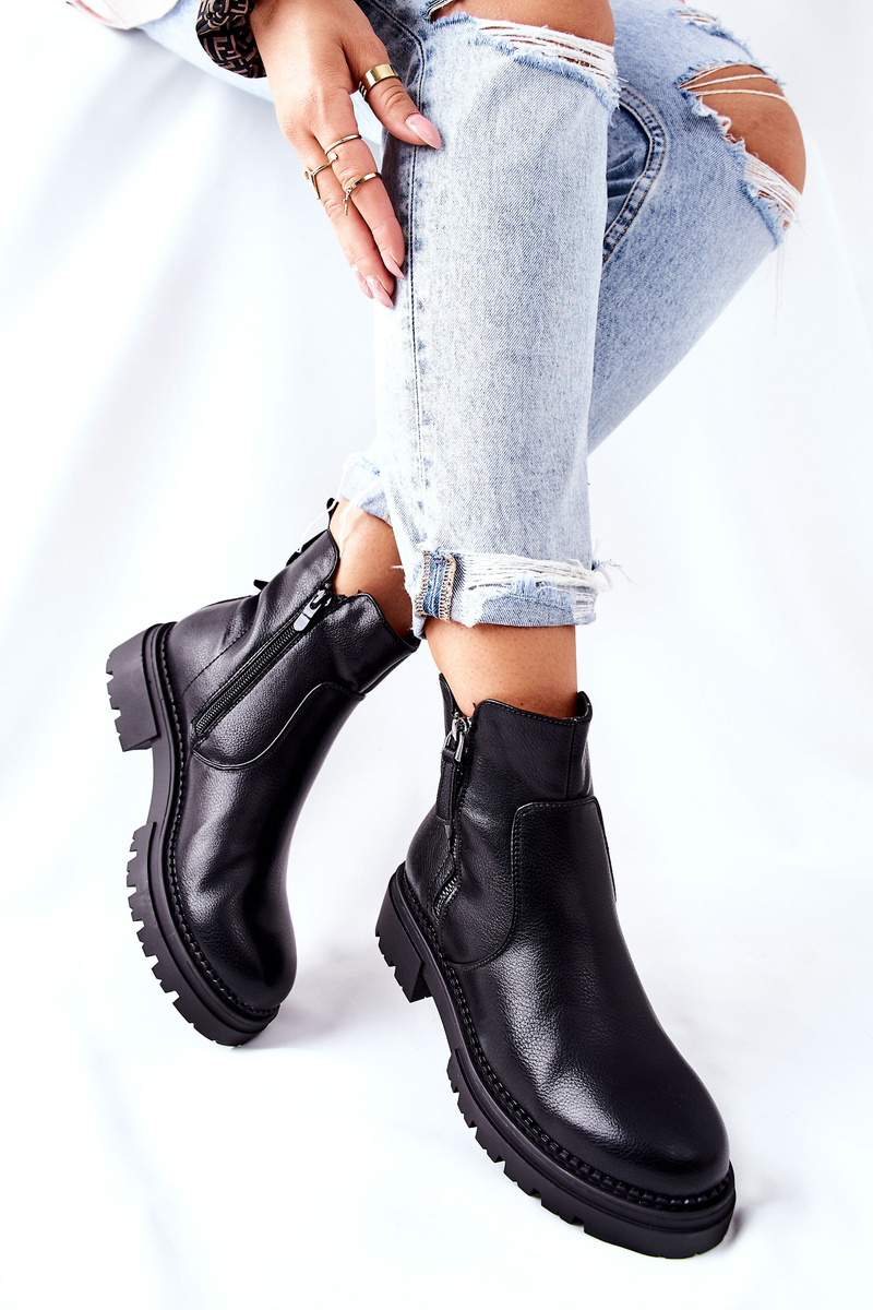 Boots with zippers on both sides. Made of ecological leather. Insulated with shoe blanket. With a decorative clasp at the back of the upper. Stable sole makes shoes very comfortable in use. They will match many stylisations. When choosing the size, please refer to the size chart.