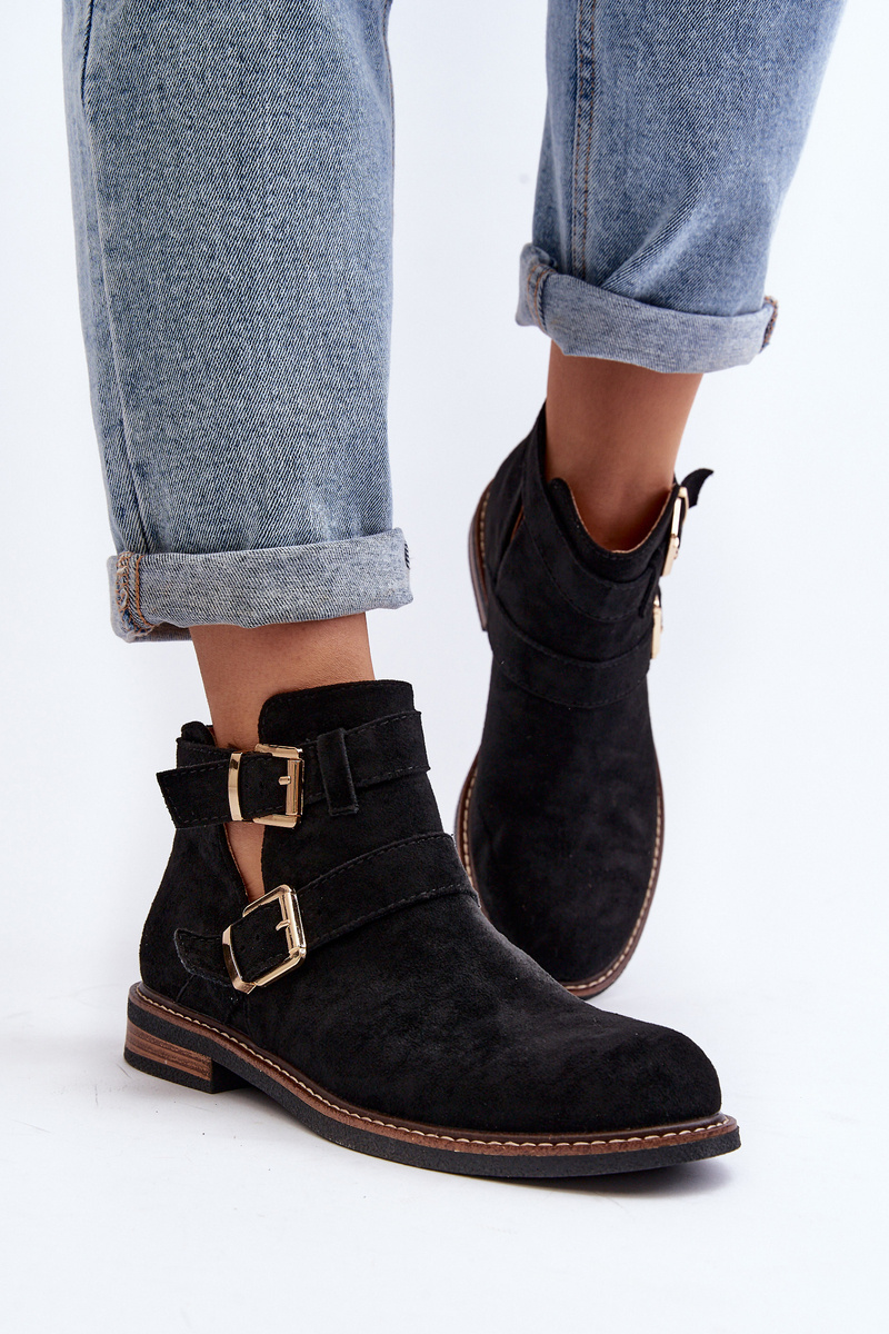 Classic women's ankle boots made of eco suede. Set on a flat heel. The upper is decorated with straps with a buckle. Slip-on model. Rounded toes. Additionally, this model has a reinforced heel cap. Perfect for many spring stylings with trousers, skirts, and dresses. When choosing a size, please refer to the size chart.
