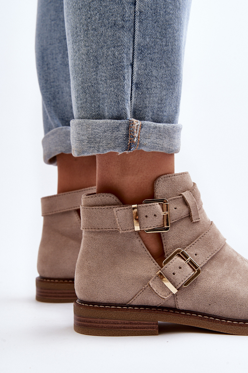 Classic women's ankle boots made of eco suede. Set on a flat heel. The upper is decorated with straps with a buckle. Slip-on model. Rounded toes. Additionally, this model has a reinforced heel cap. Perfect for many spring stylings with trousers, skirts, and dresses. When choosing a size, please refer to the size chart.