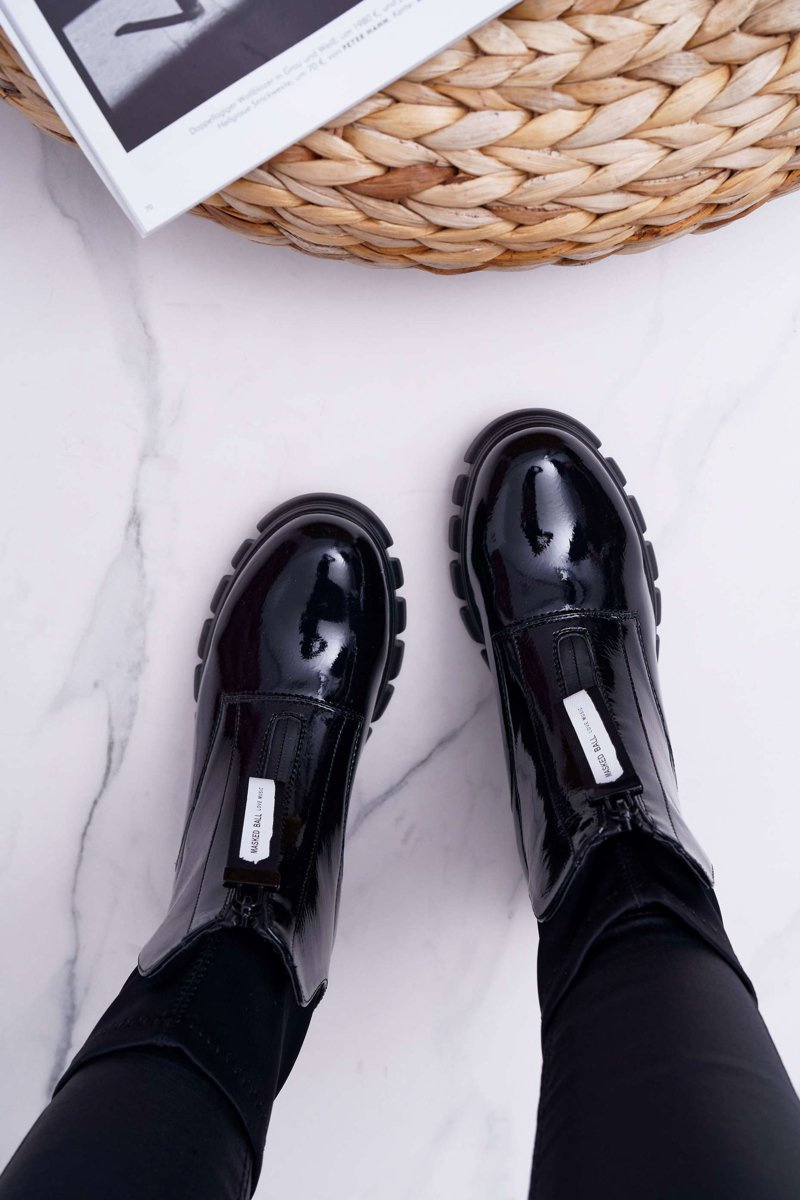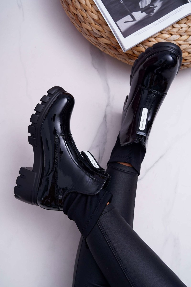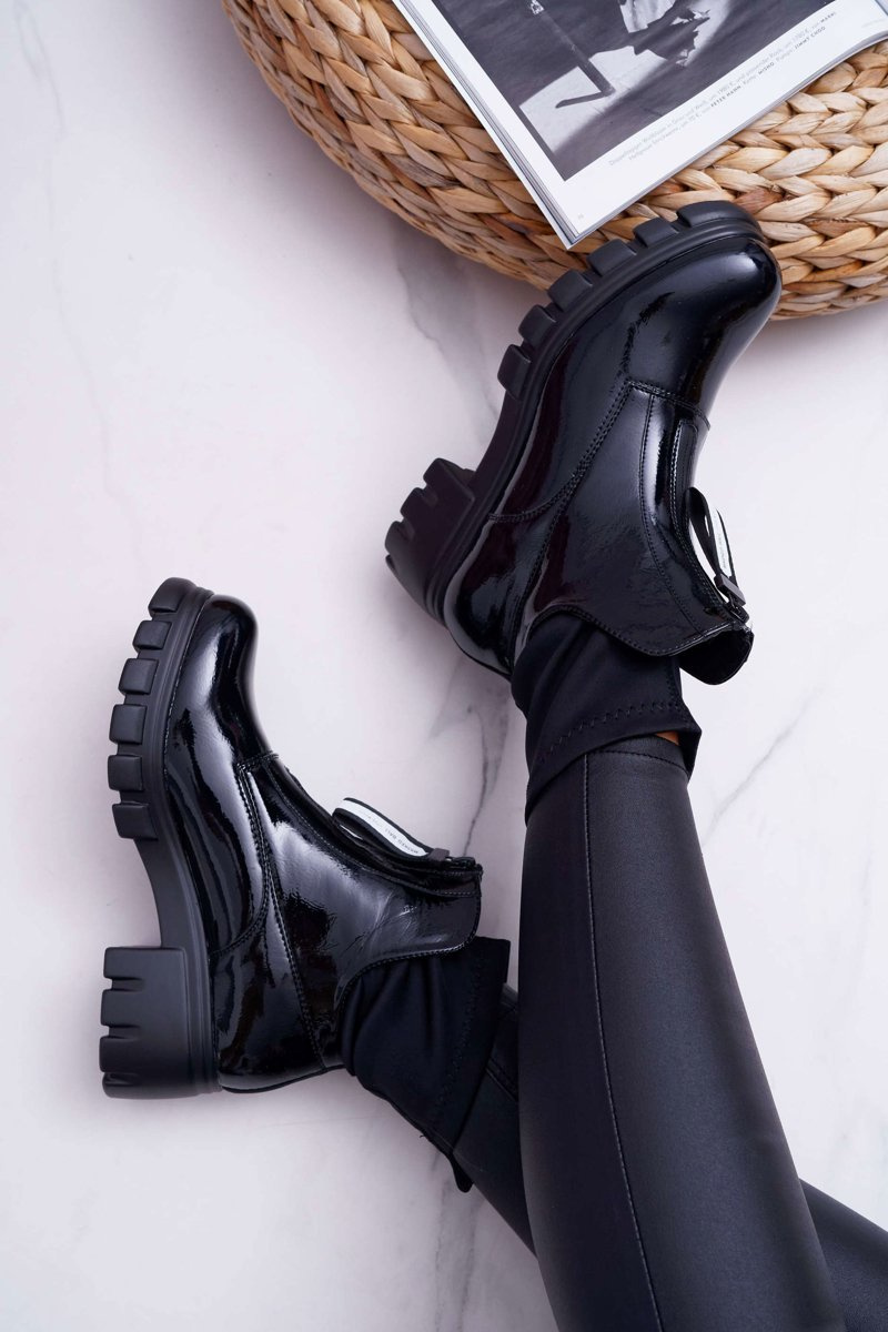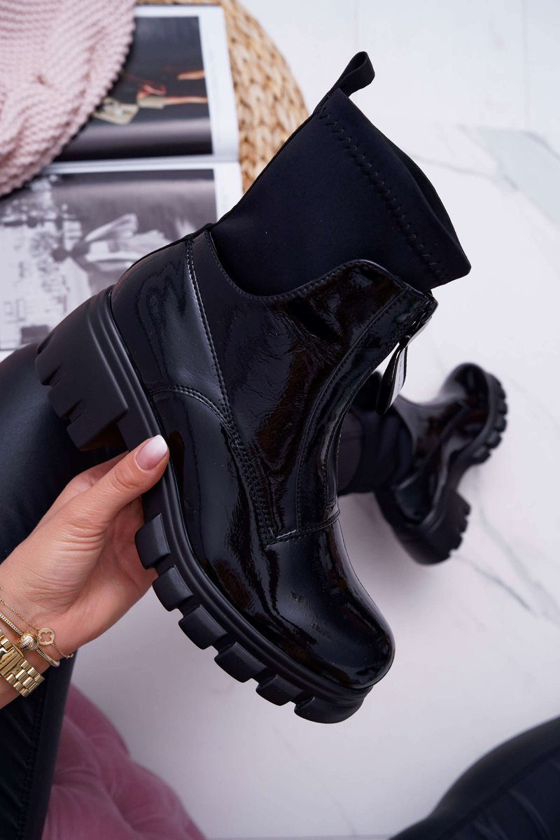 Emelia boots made of black patent eco-leather. Modern design in glamour style. Slip-on boots finished with an elastic "sock". The decoration in the form of a zipper with an inscription emphasizes their uniqueness. When choosing the size, please suggest the size chart, which is available after hovering over or clicking on the size.