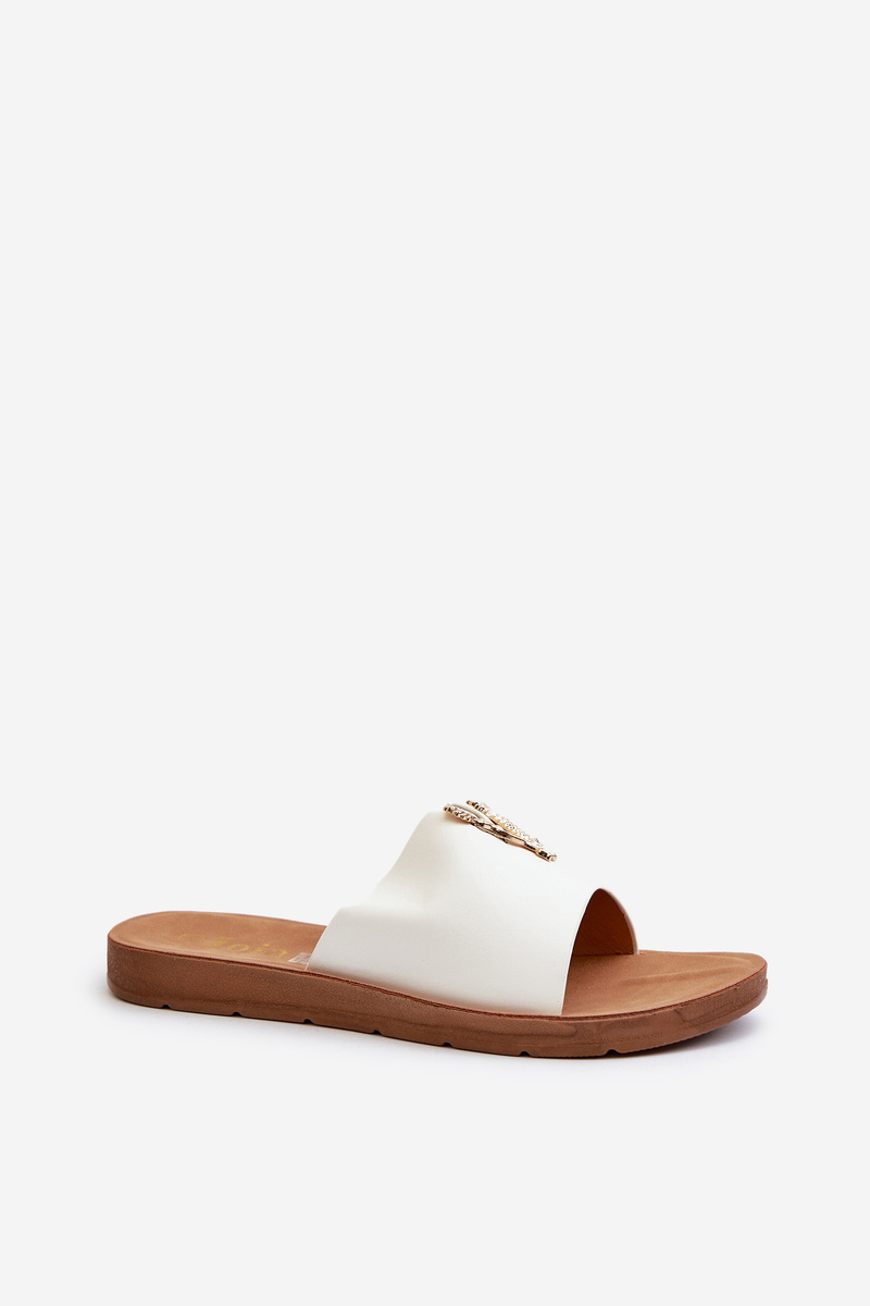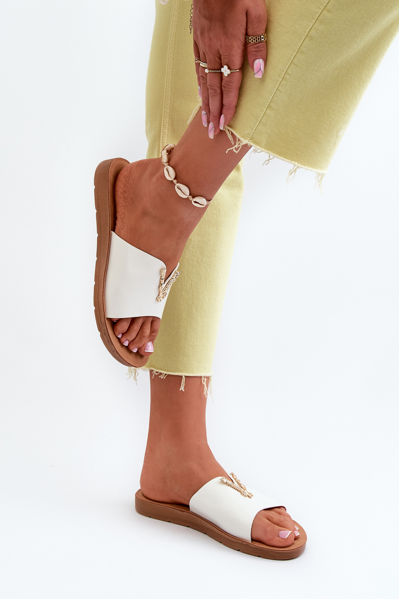 Women's sandals made of eco leather. Set on a flat sole. The gold decoration adds a subtle elegance to them, making them perfect for both everyday walks and summer outings. The perfect footwear for warm summer days! When choosing a size, please refer to the size chart.