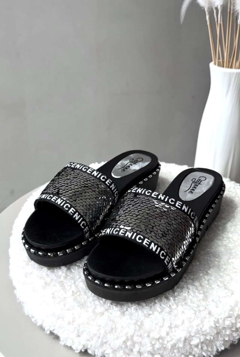 Women's Flip Flops With Sequins Black-Silver Rivanique