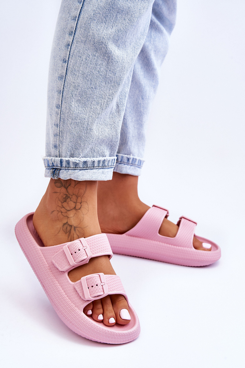 Classic, women's slippers are made entirely of foam material. They have plastic buckles with adjustable straps. This model was mounted on a massive platform. Perfect footwear for the summer season. These slippers are extremely airy and comfortable. They are also great for the pool or beach. When choosing a size, please refer to the size chart.