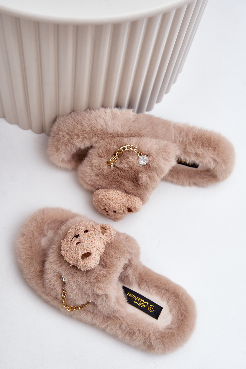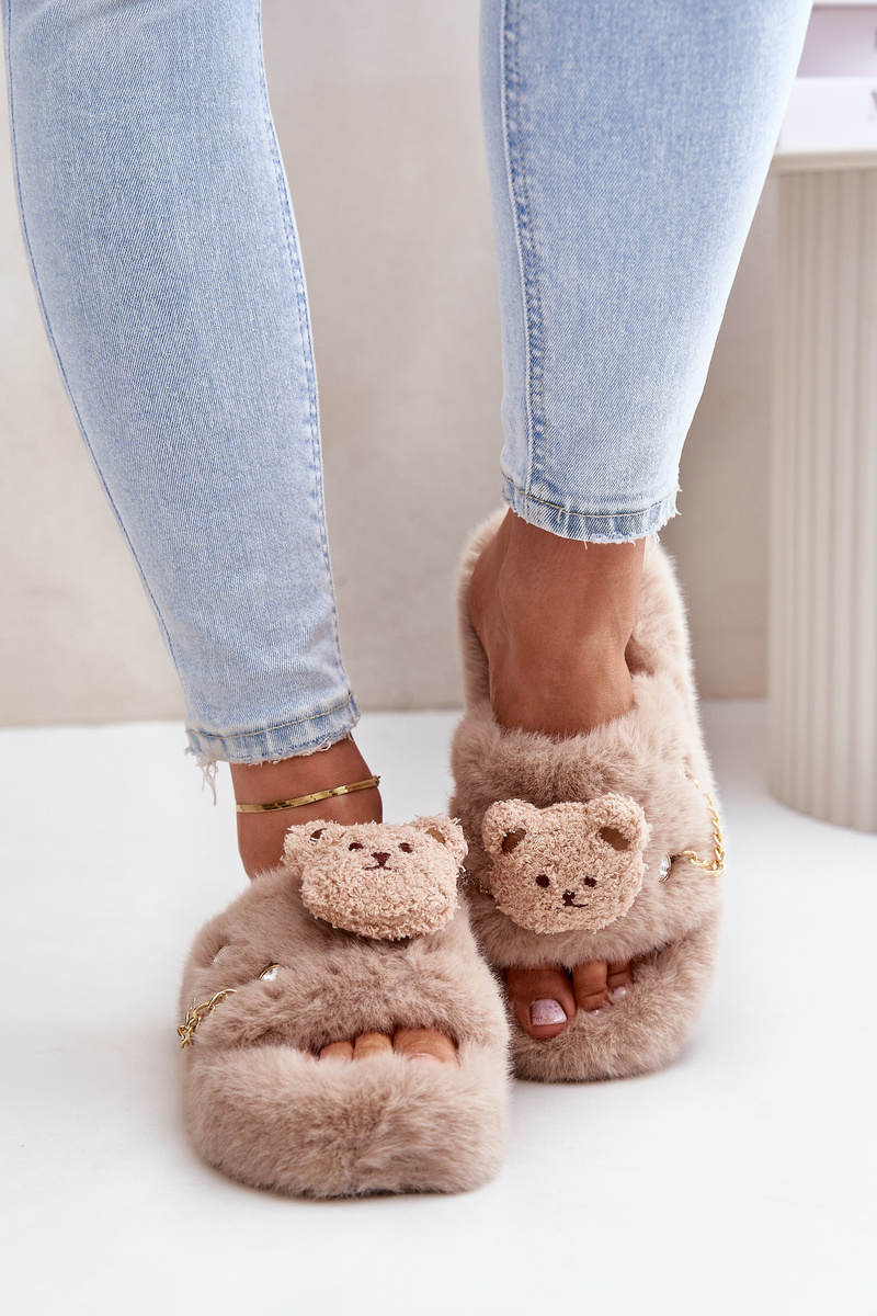 Women’s Furry Slippers With Bear And Decorative Elements Beige Innalise