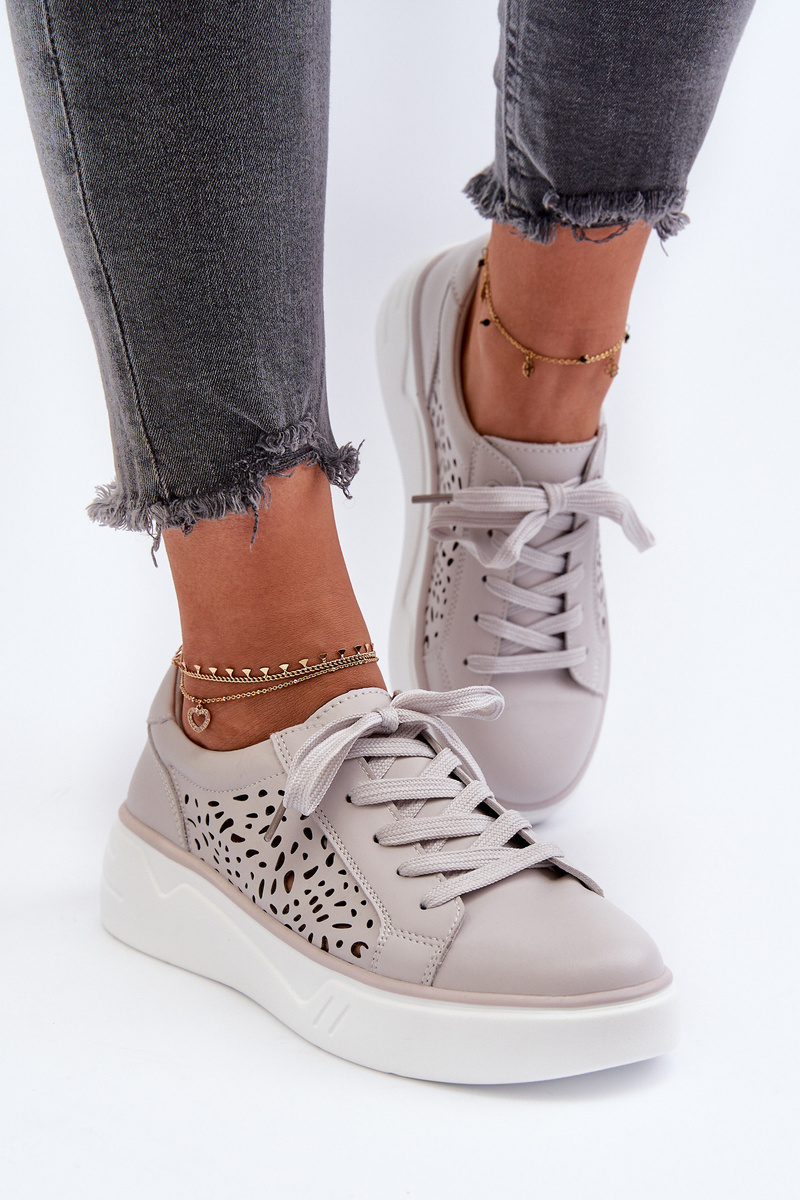 Women's sneakers made of high-quality natural leather. The latticed upper adds originality. Set on a platform that provides stability. Rounded toes. The soft insole makes wearing them very comfortable all day long. When choosing a size, please refer to the size chart.