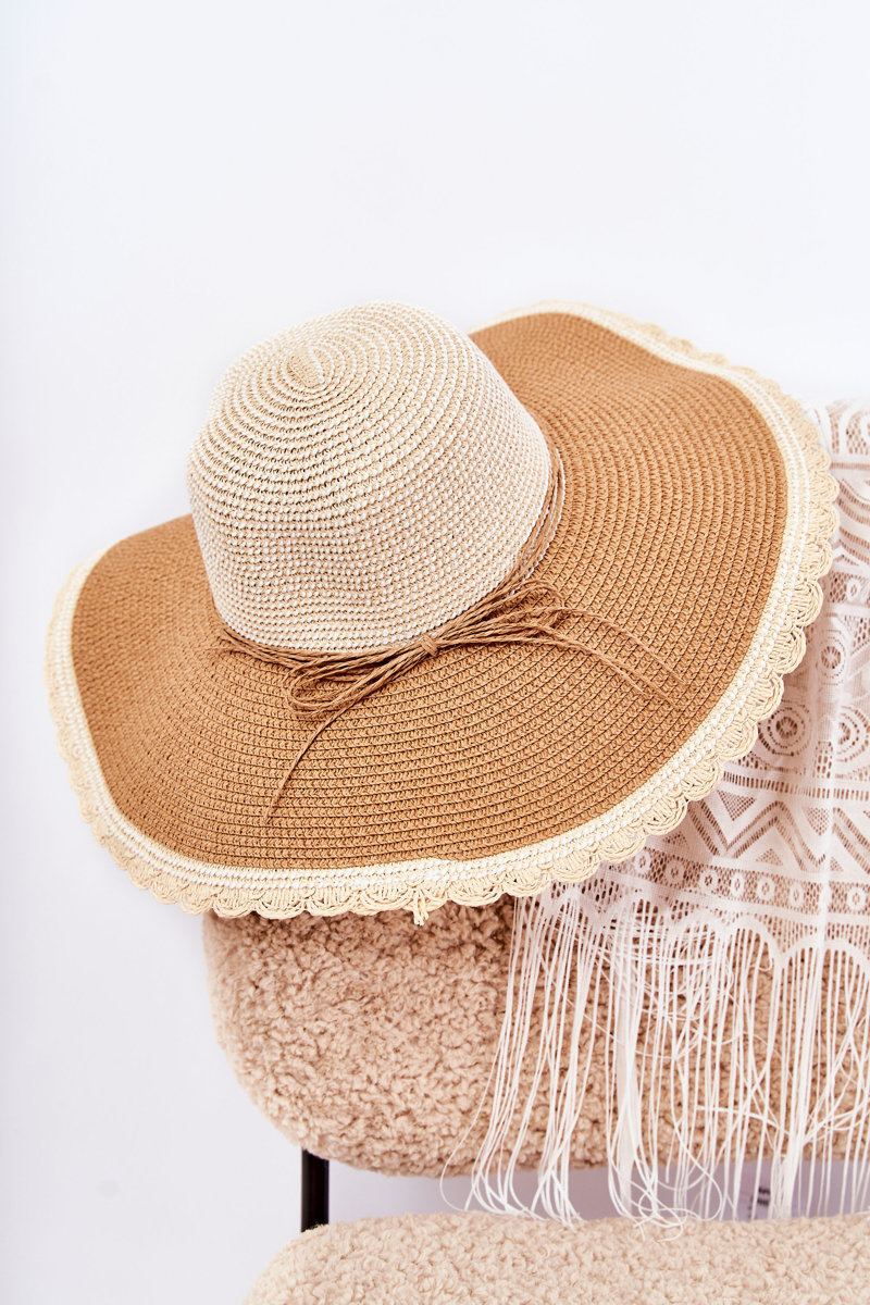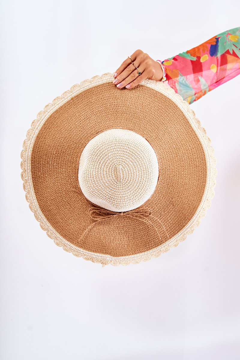 Women's hat with a decorative string tied with a bow. The product is made of 100% paper. It has a string that allows adjustment and adjustment to the head circumference. There are cute frills on the edge of the roundabout. The hat is perfect for hot days! Be sure to check out our entire collection of hats!