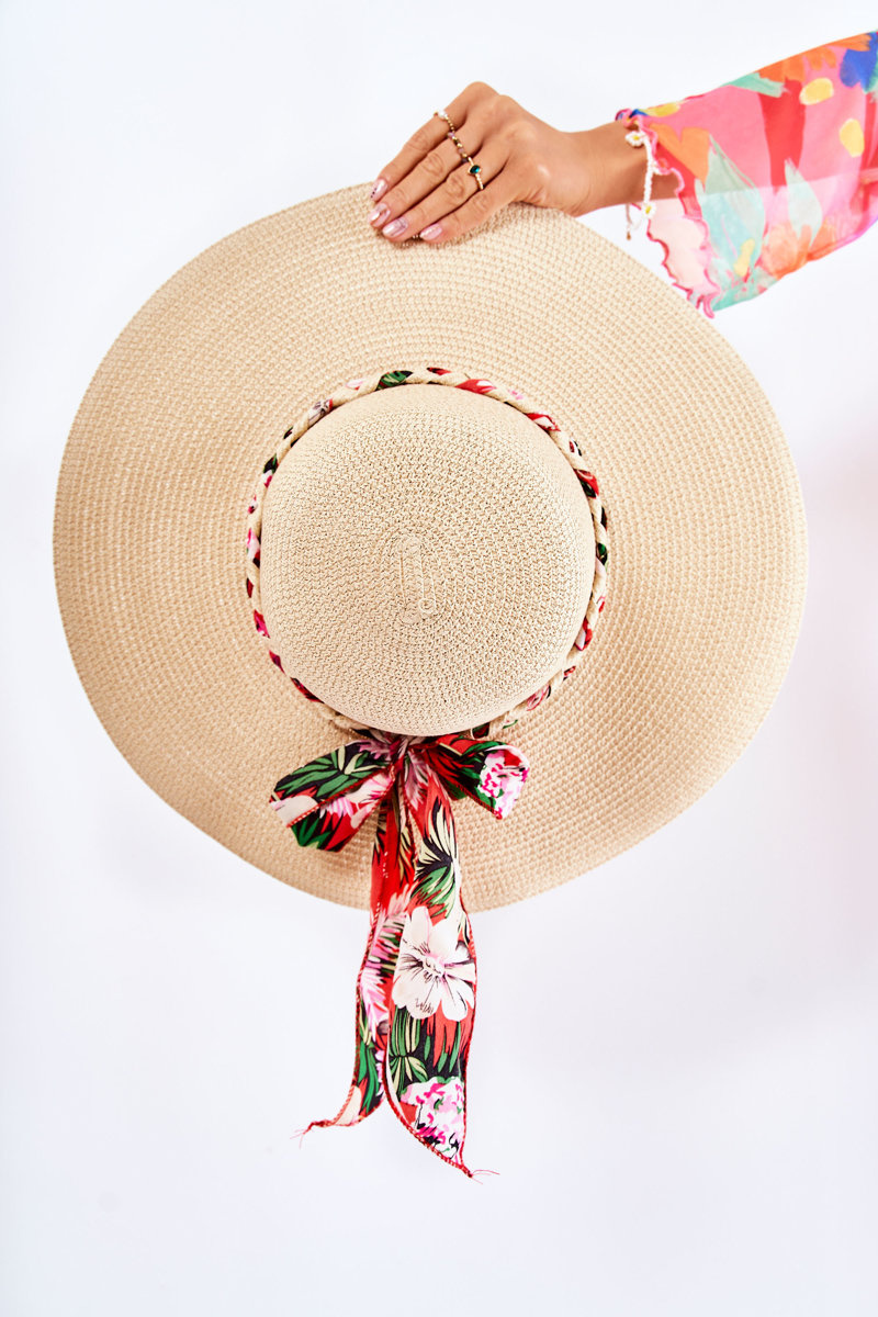 Women's hat with a beautiful belt, which has a colorful bow with a flower motif. The product is made of 100% paper. It has a string that allows adjustment and adjustment to the head circumference. The brim of the hat is quite wide. You can use the hat during holidays on hot days. Be sure to check out our entire collection of hats!