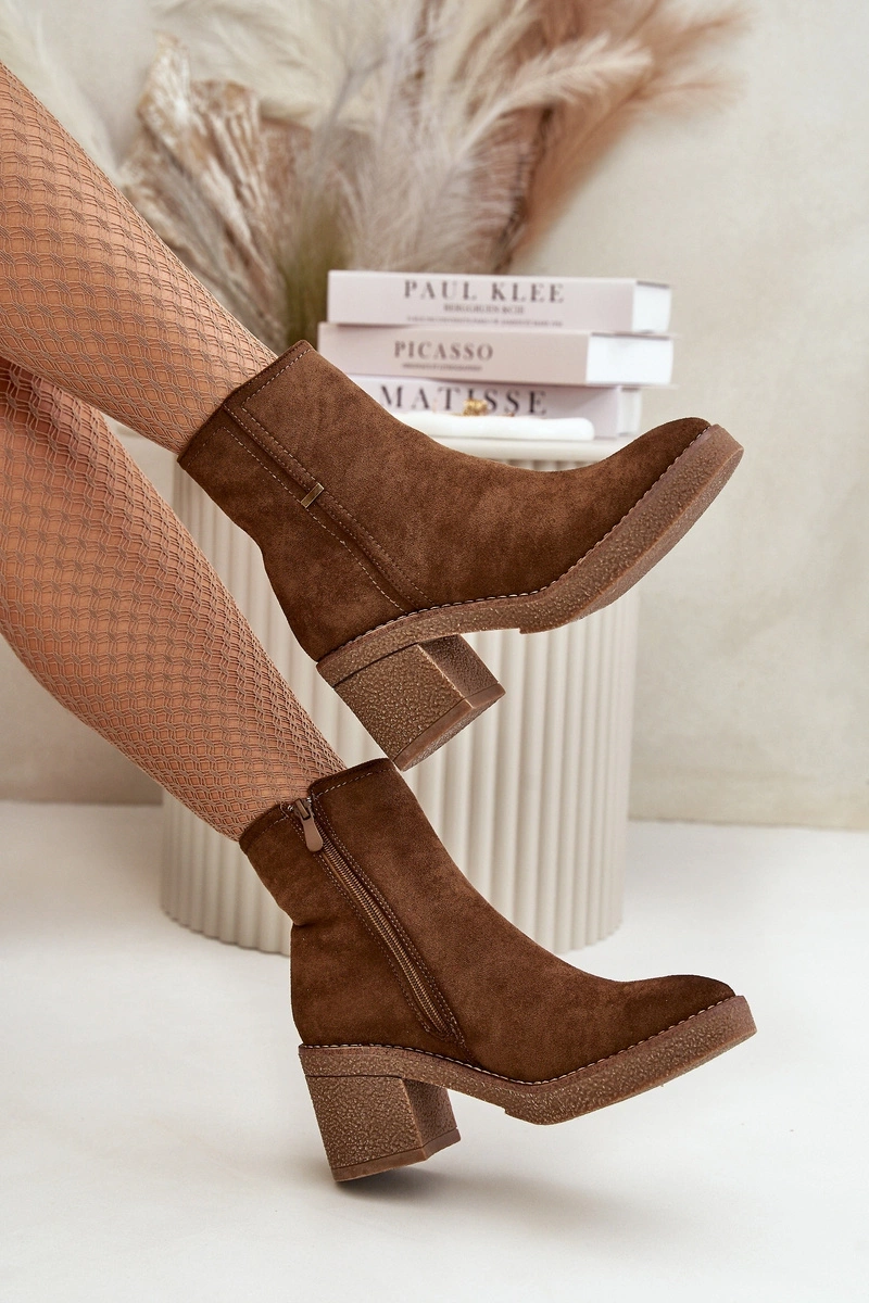 Women's ankle boots made of eco-suede, which is soft and pleasant to the touch. Set on a stable block heel, providing comfort and confidence in walking all day long, while adding a few centimeters in height and emphasizing the silhouette. The interior is lined with a shoe fleece, ensuring warmth and comfort on cooler days, protecting the feet from the cold. Thanks to the zip closure, putting them on and taking them off is quick and hassle-free, which is a great advantage for everyday use. When choosing a size, please refer to the size chart.