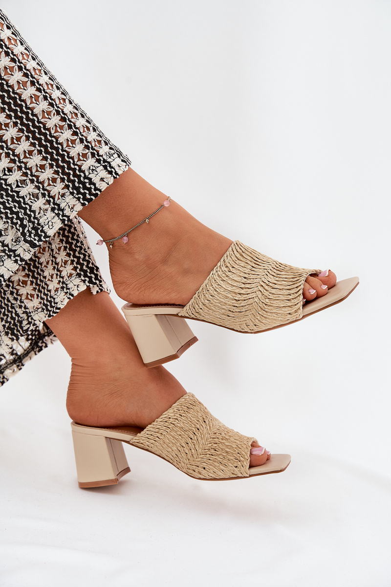 Stylish women's slides with weaving that combine a modern look with classic comfort. Set on a block heel, they provide stability. Insole made of eco-leather. The weaving adds a subtle charm, and the simple yet striking design makes them an ideal choice for summer days. They pair perfectly with both light dresses, flowing skirts, and casual pants. When choosing a size, please refer to the size chart.