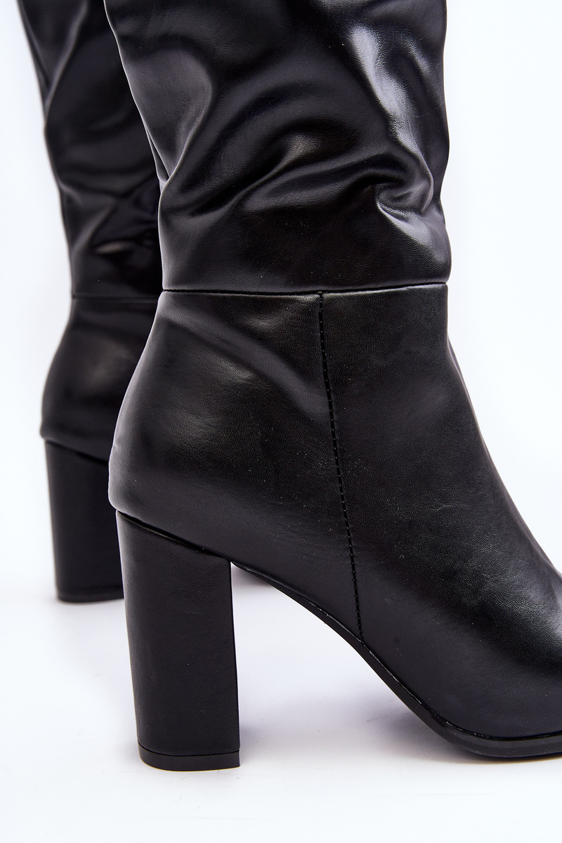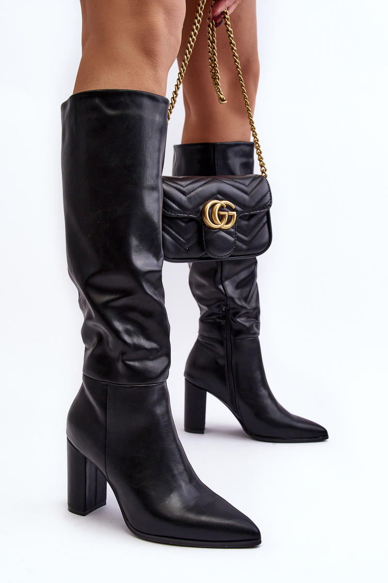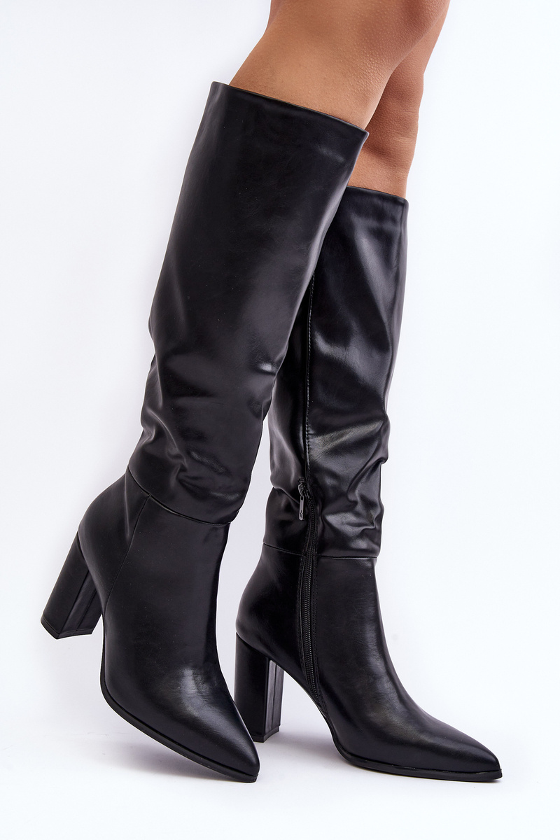 Women's knee-high boots. Made of eco leather. Block heel. Pointed toes will visually elongate the legs. Slip-on model with additional zipper closure. This elegant style will match dresses, skirts or pants! When choosing a size, please refer to the size chart.