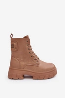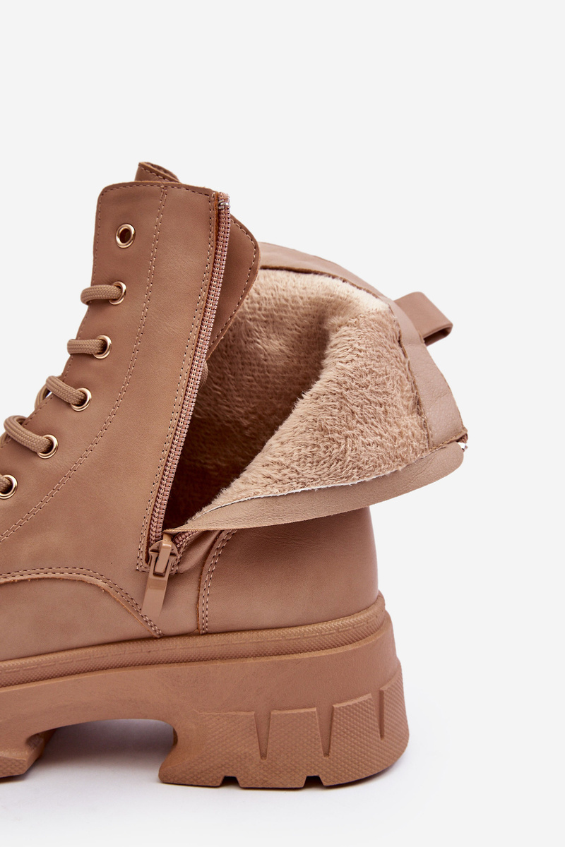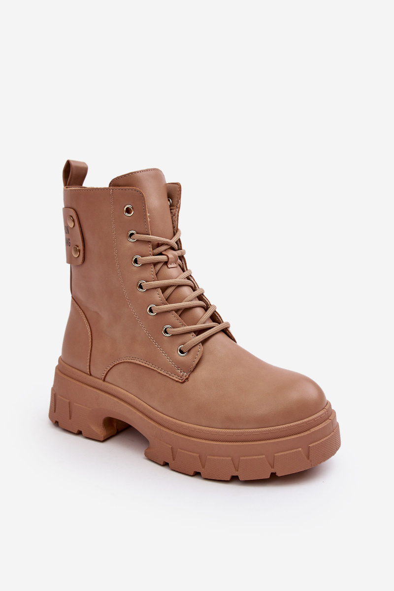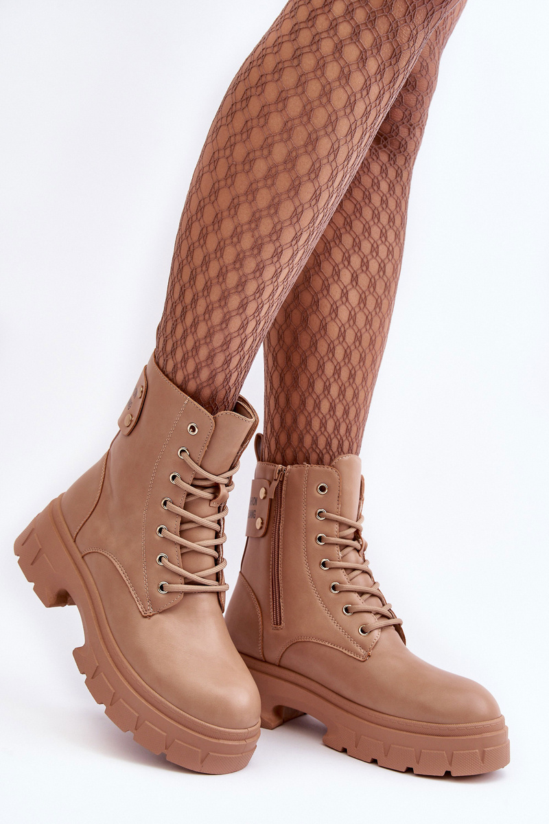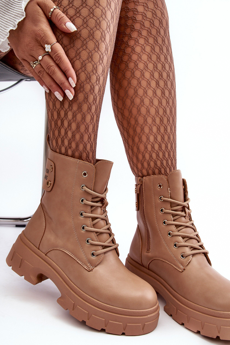Women's ankle boots set on a flat heel and platform. Made of eco leather. Lacing in front and additional zip closure. Insulated with a shoe lining. Thick strap with writing on the back of the upper. Great model for autumn and winter stylizations! When choosing a size, please refer to the size chart.