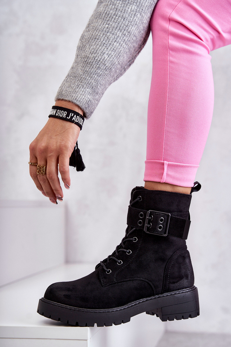 Women's Lace-up Suede Flat Heel Boots Black Firmina