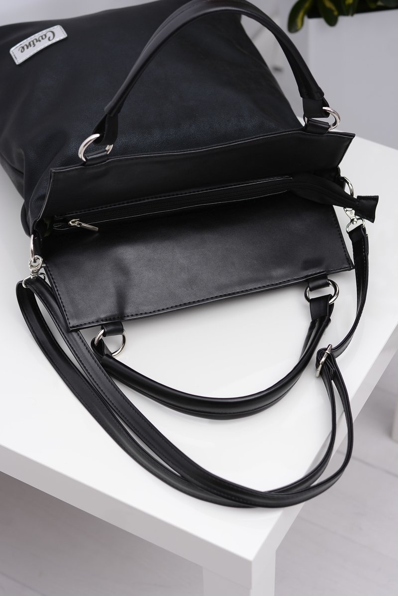 A large and capacious classic handbag sure to be useful for any woman. One large compartment with three small pockets including one zippered pocket. One additional pocket on the outside. The whole bag is zippered. The bag has two straps, one shorter, a long longer one.