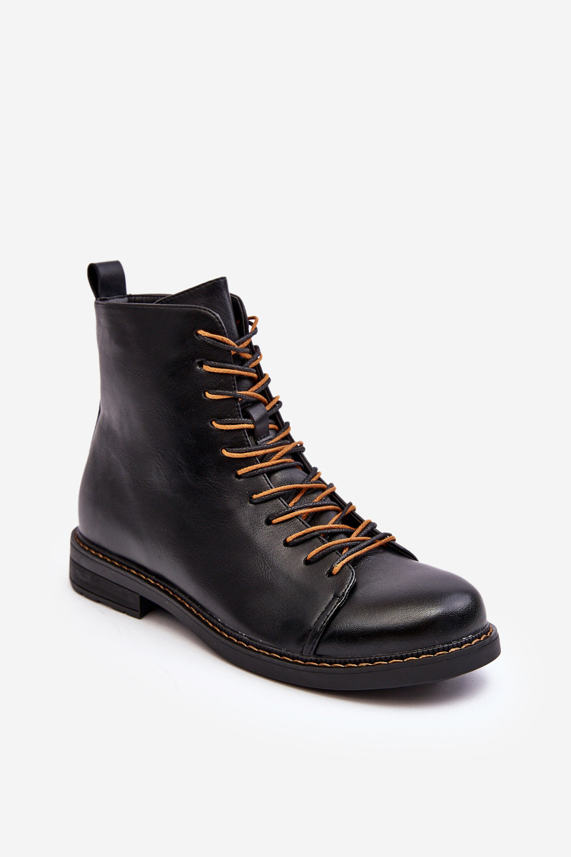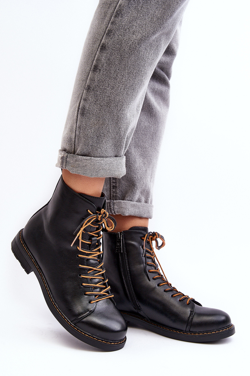 Comfortable women's boots have been made of eco leather. They have a side zipper closure of the shaft and additional lacing. This model is mounted on a flat heel. The toe of this shoe is stiffened. They were insulated with a shoe blanket. These shoes will fit perfectly into autumn-winter outfits! When choosing a size, please refer to the size chart.