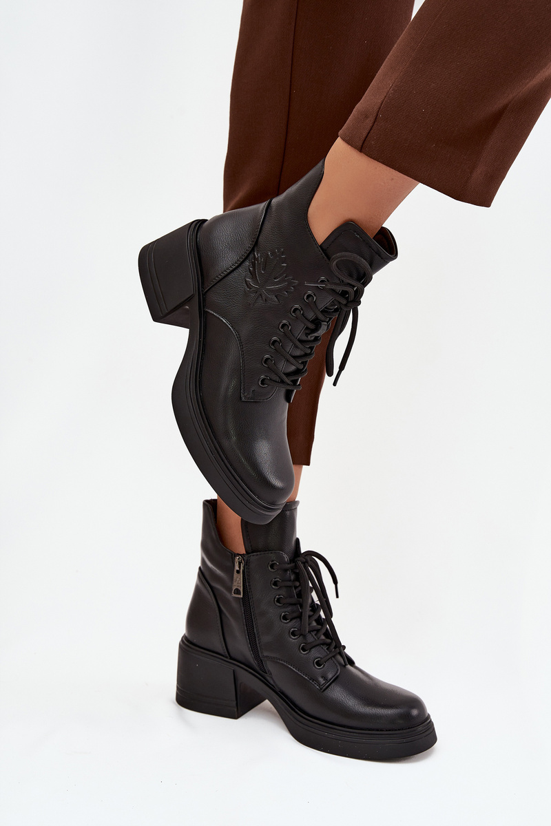 Women's ankle boots by Vinceza made from genuine leather are perfect footwear for colder days. The stable block heel provides comfort during wear, and the combination of laces and a zipper makes it easy to put on and adjust to the foot. The interior is lined with a soft shoe blanket to ensure warmth and comfort, while subtle leaf-shaped embossing on the side adds a stylish touch. This model is suitable for both everyday wear and more elegant outfits. Please refer to the size chart when choosing your size. When choosing a size, please refer to the size chart.