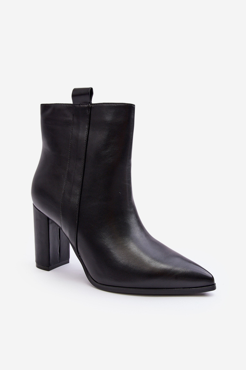 Women's boots made of eco leather. Insulated with a shoe pad. Heel in the form of a stable column. Pointed toes will optically slim the legs. Upper fastened with a zipper on the side. Perfect for many stylizations such as dresses, skirts or trousers. These boots must definitely find a place in your wardrobe! When choosing a size, please refer to the size chart.