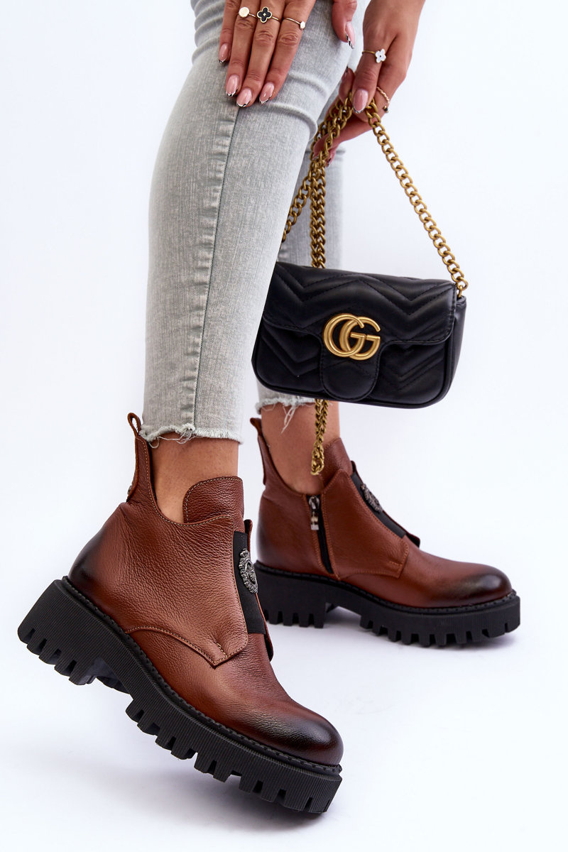 Women's boots have been made of high-quality natural leather. Set on a massive heel and platform with grooves. The model is fastened with a zipper on the inner side of the upper. On the front, on an elastic insert, there is a decoration made of plastic. The interior is insulated with a shoe lining. This unique model will enrich many of your looks! When choosing a size, please refer to the size chart.