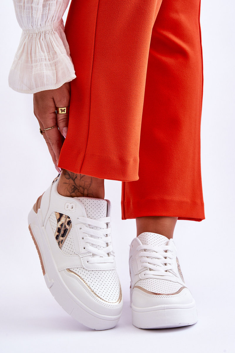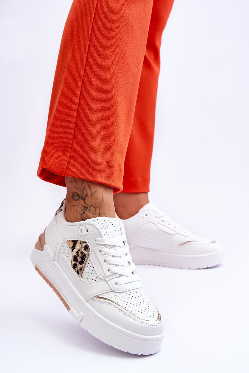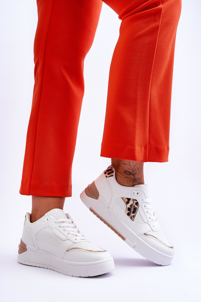Classic, women's sports shoes are made of eco leather. There is an additional perforation on the upper. The shoes were set on a massive platform. A soft, material-made insole will ensure comfortable use. Thanks to the flat sole, these shoes are extremely stable. When choosing a size, please refer to the size chart.
