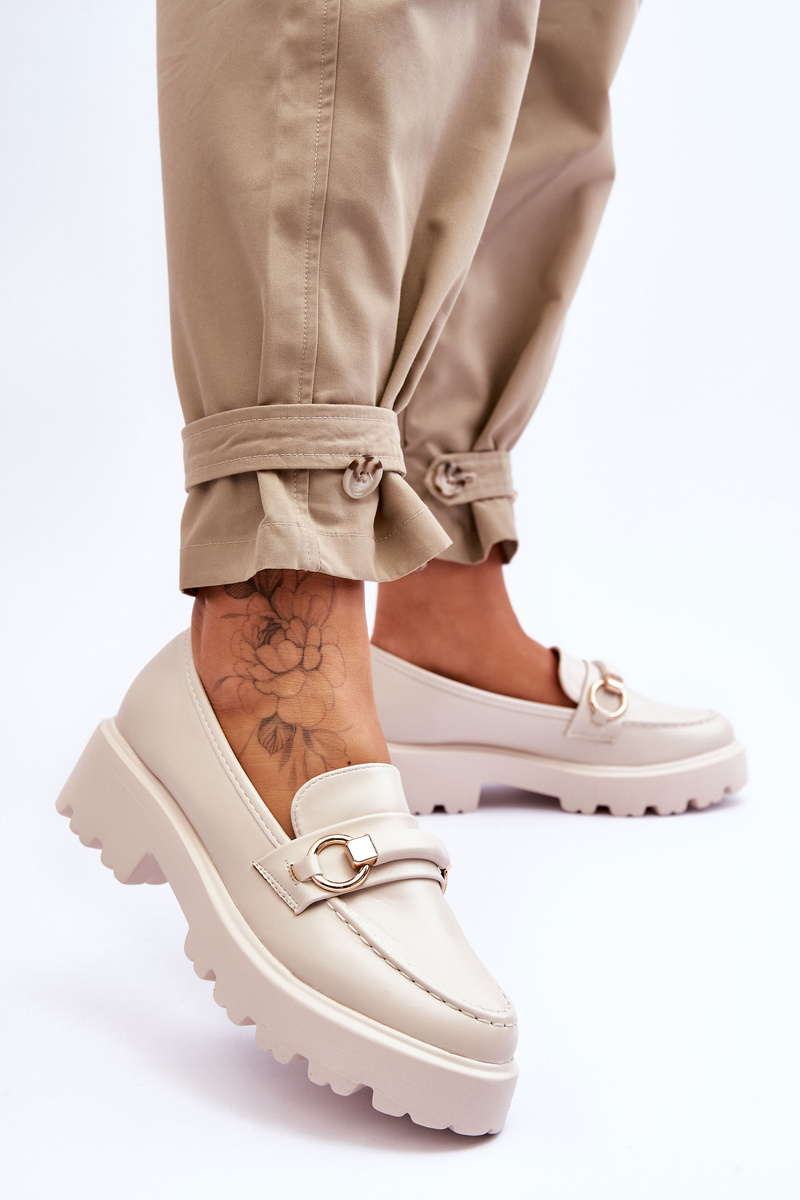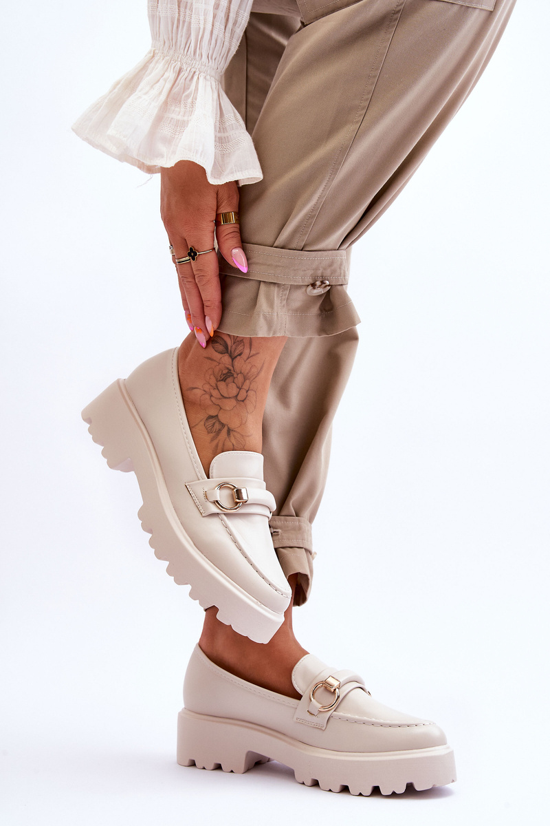 Fashionable, women's moccasins have been set on a flat heel and a platform. They have a decorative stripe on the front. Made of eco leather. This model is extremely comfortable to use. The heel counter in these shoes is slightly stiffened. The perfect model for the spring-autumn season! When choosing a size, please refer to the size chart.