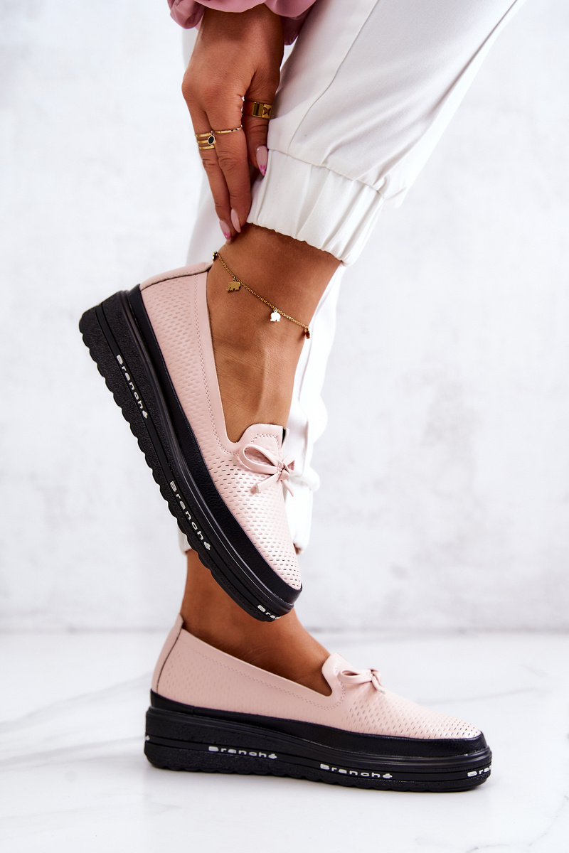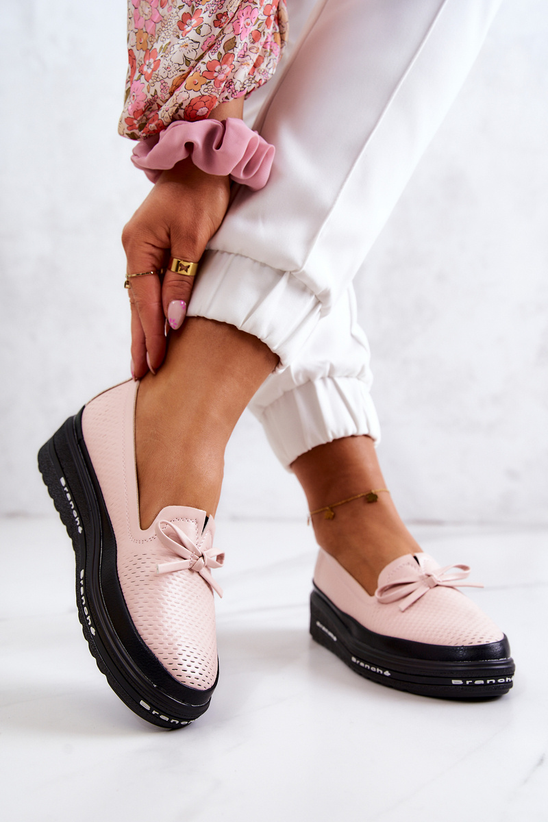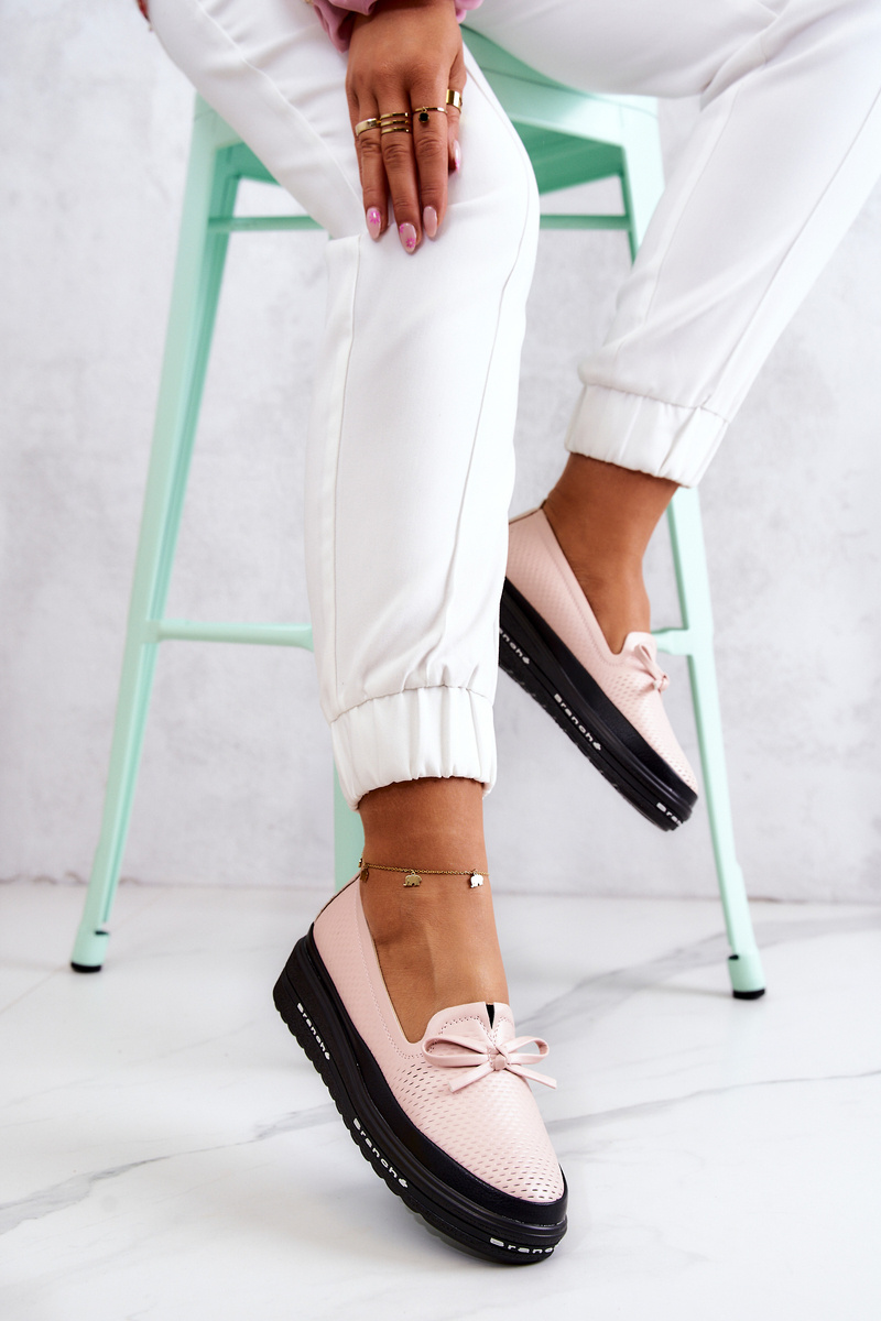 Moccasins have a natural, leather insole that provides your feet with comfort and softness. Great footwear that will give you complete freedom of walking every day. This model has an upper with an interesting pattern with cuts made of eco leather. On the front there is a charming bow made also of eco leather. The platform with a low wedge is decorated with an inscription on the side. A slip-on model that is easy to put on and take off. When choosing a size, please use the size chart.
