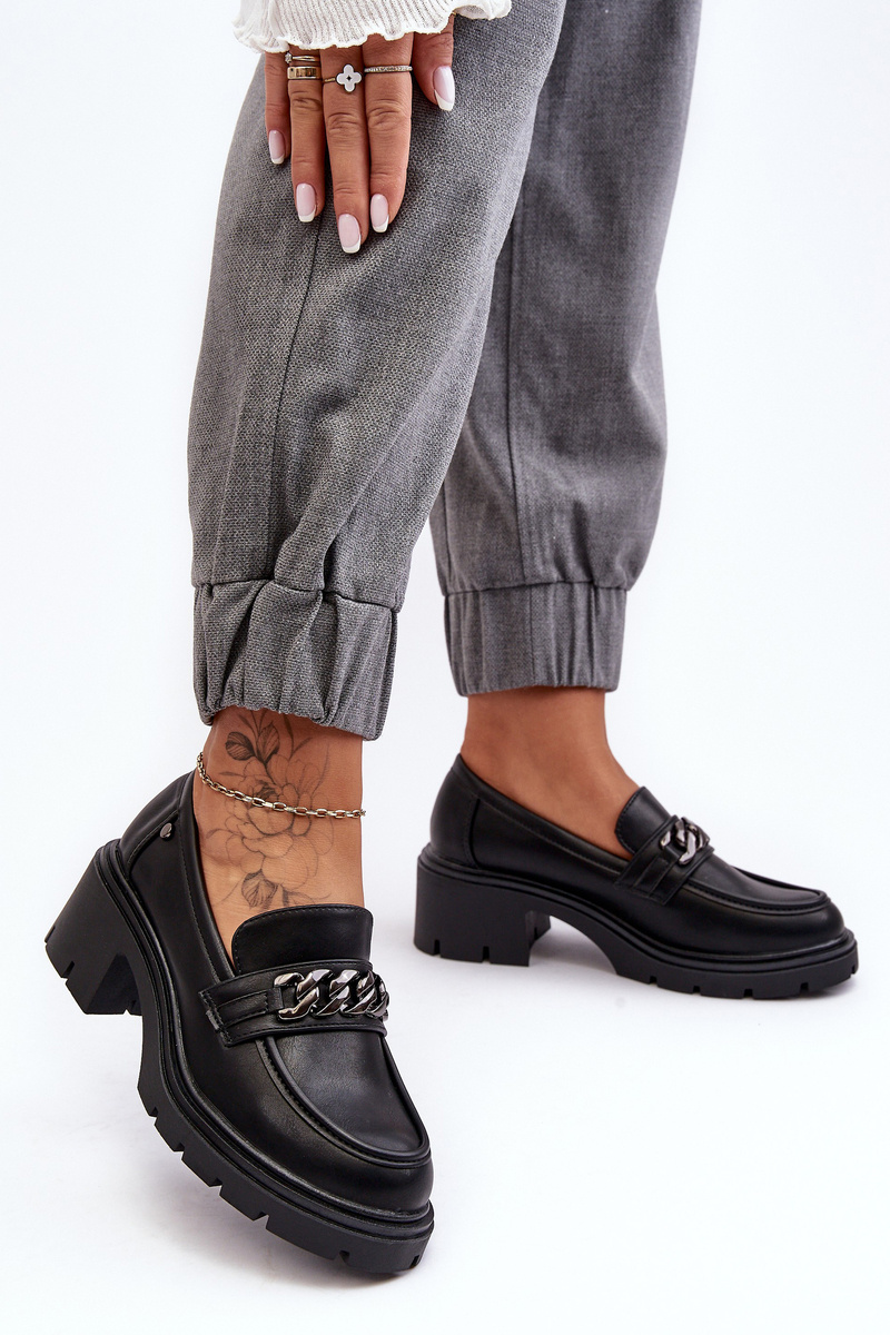 Women's half boots set on a low, chunky heel. Made of eco leather. On the front, a chain ornament on a strap. Round toes. Eco leather, soft insole will provide comfort during use. In addition, the toe is stiffened. When choosing a size, please refer to the size chart.