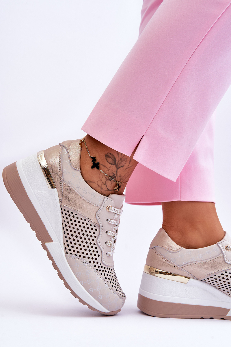 Classic sports shoes are made of high-quality natural leather, which additionally has an openwork pattern. These sports shoes also have a comfortable Comfort insole made of natural leather. The shoes were placed on the platform with a wedge. In addition, there is a mirror element in the heel. Classic lace-up model. When choosing a size, please refer to the size chart.