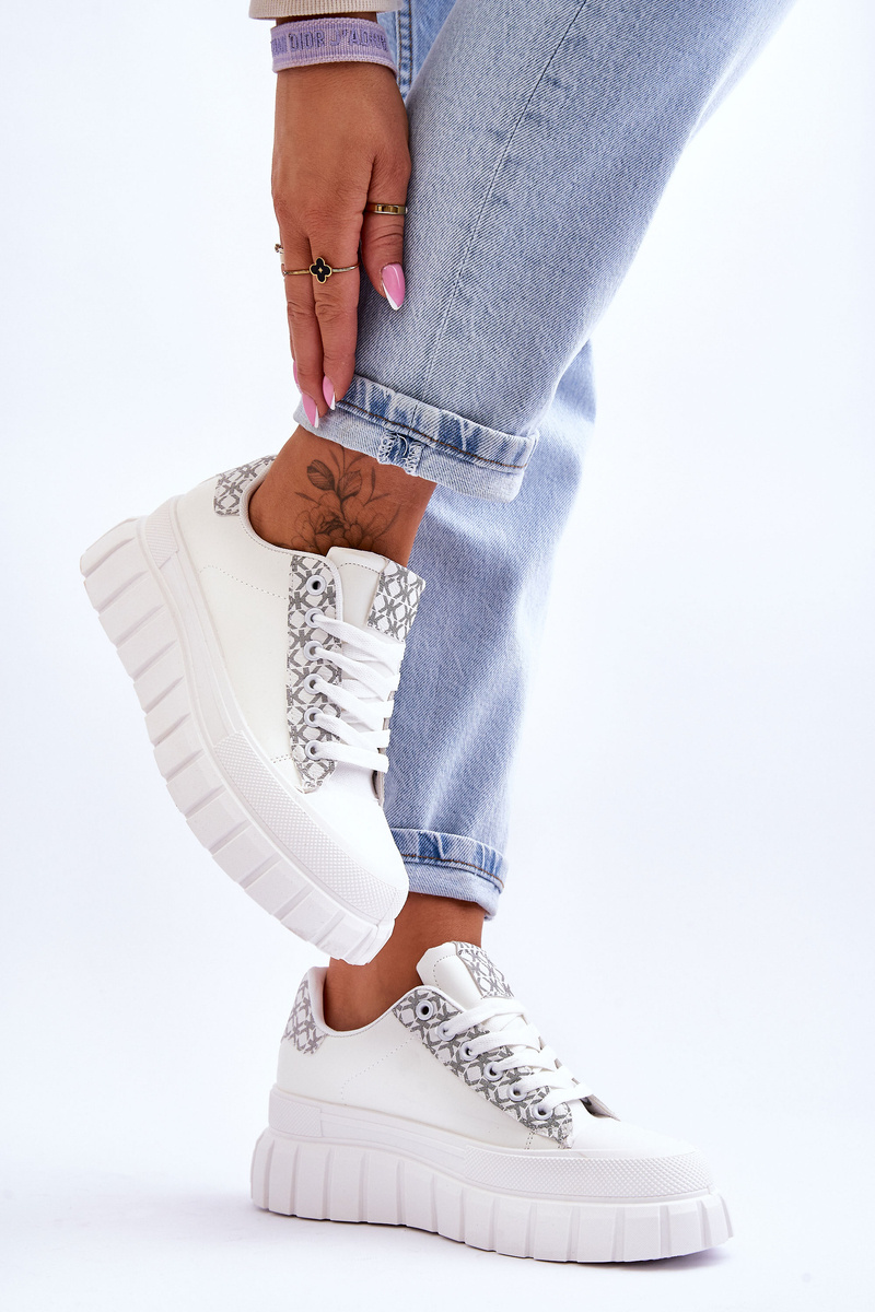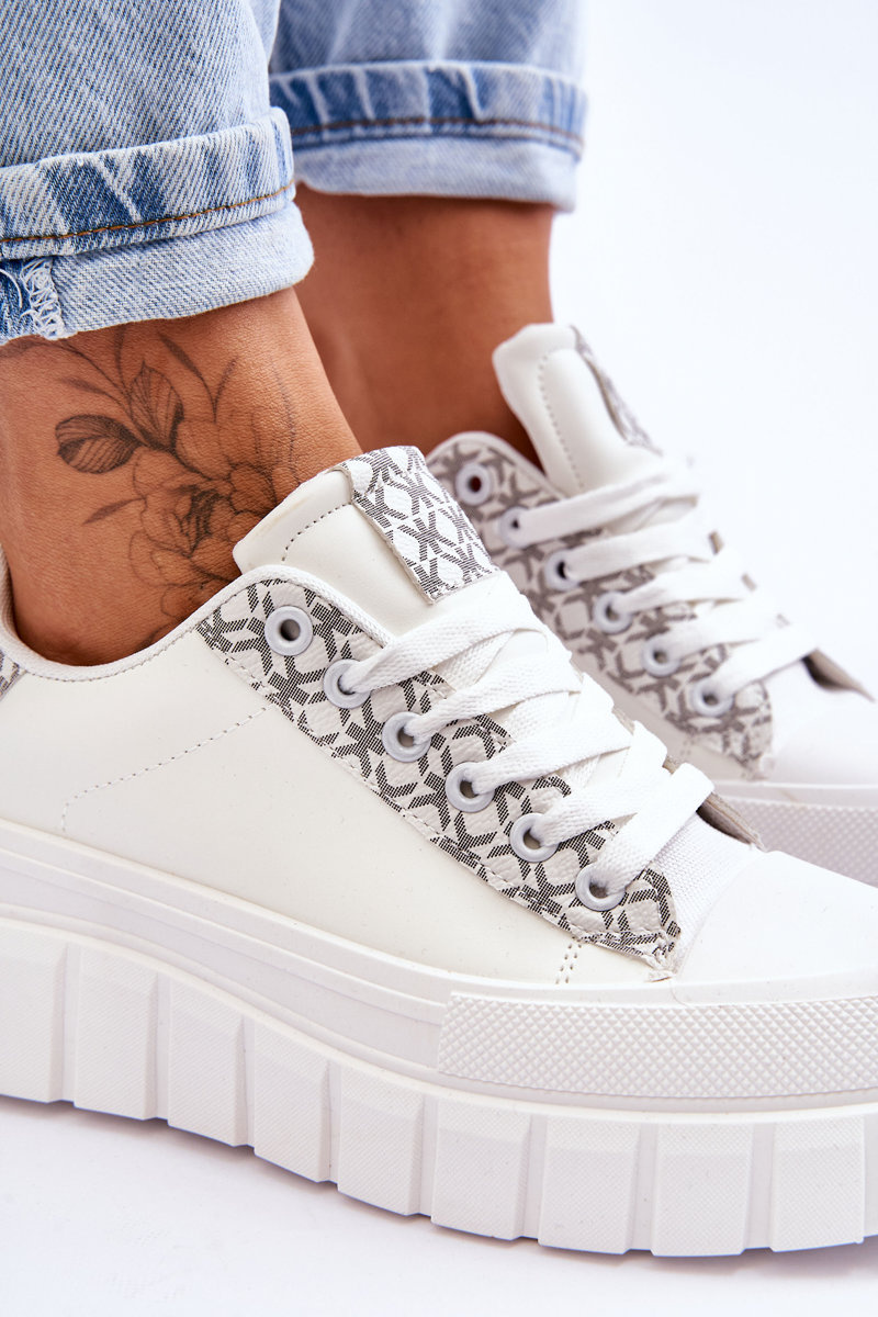 Comfortable, sports shoes are made of eco leather with a fashionable pattern. Lace-up design. The shoes were mounted on a massive platform made of plastic. The soft insole made of material will ensure comfortable use. Rounded nose. This model fits many sports styles. When choosing a size, please refer to the size chart.