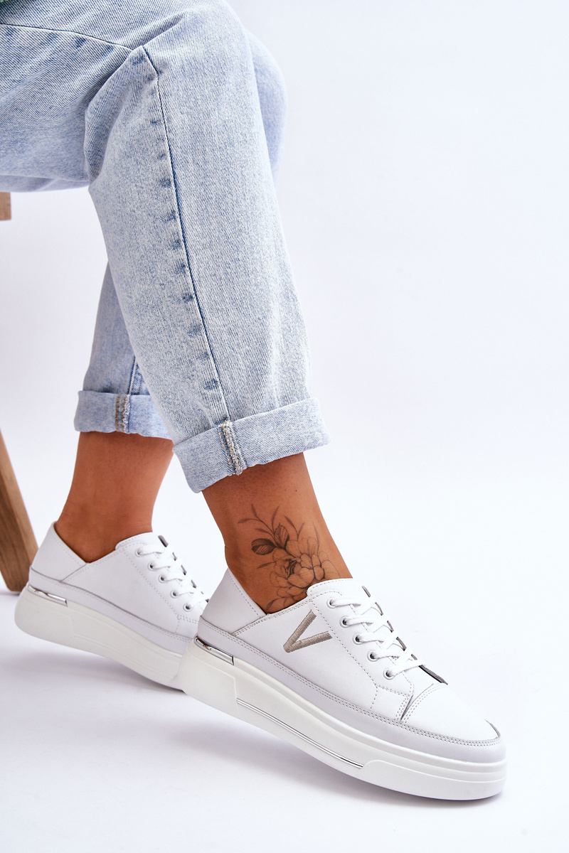 Perfect everyday shoes! For work, school, meeting friends - choose these comfortable and classic sports shoes! They are made of natural leather. The soft insole made of natural leather will ensure comfort. Sneakers were placed on the platform. There is an embroidered V-shaped logo on the side of the footwear.When choosing a size, please refer to the size chart.
