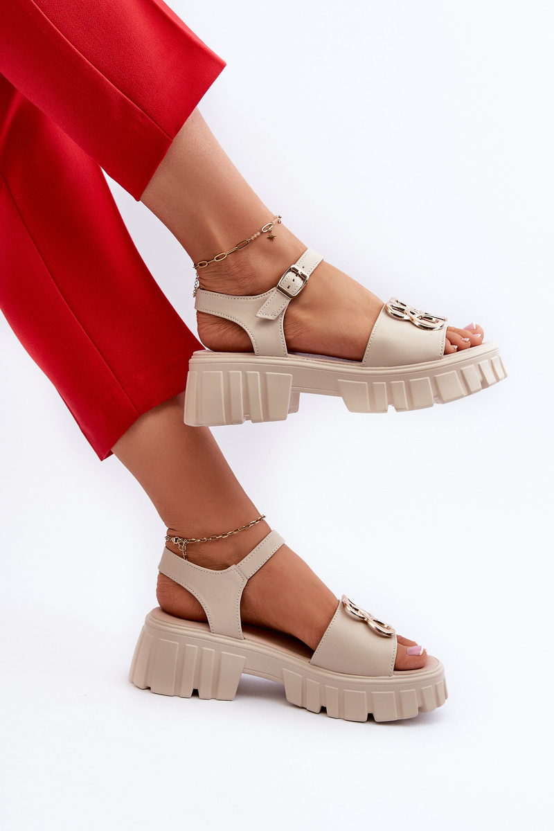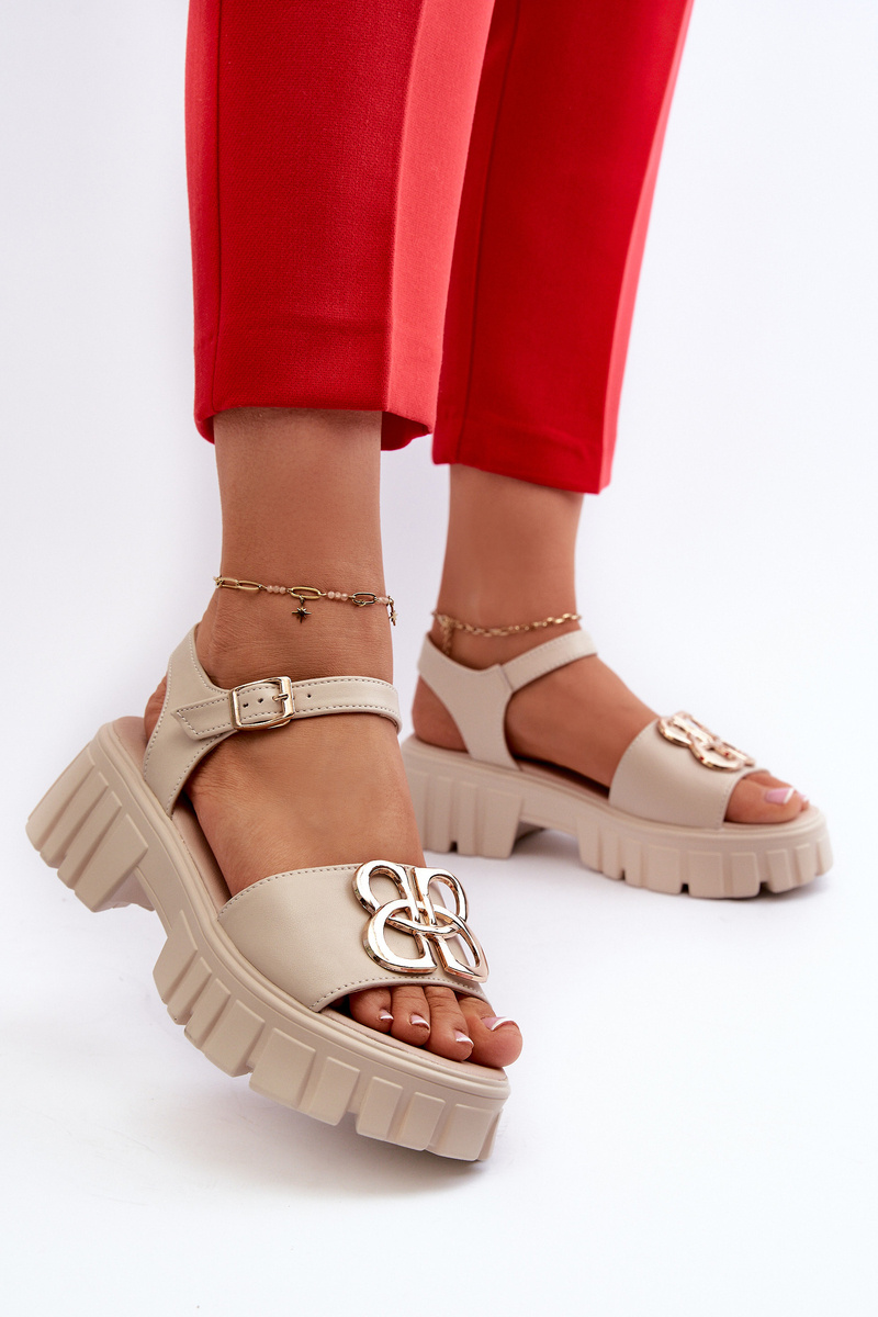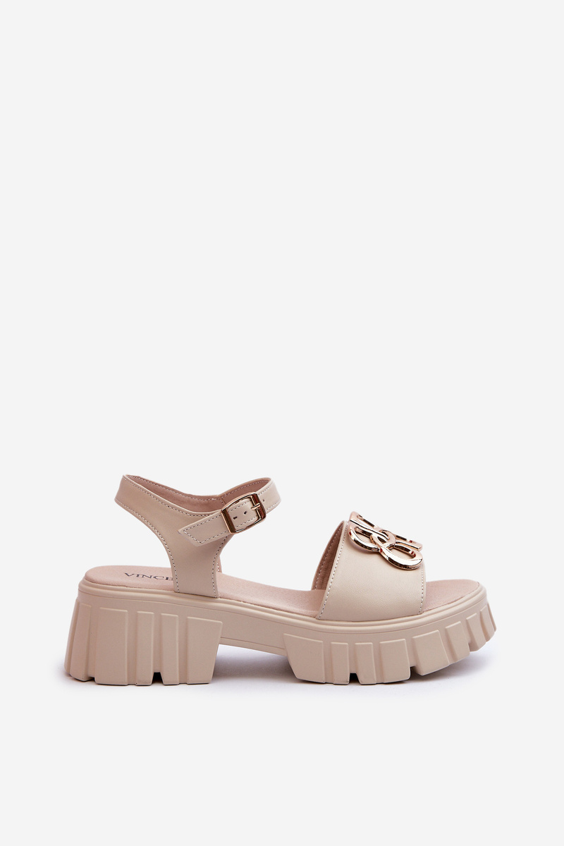Women's Leather Sandals with Gold Decoration Beige Vinceza 7910