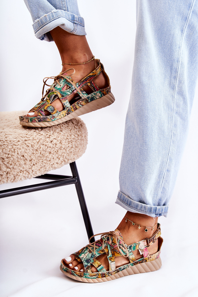 Women's sandals are made of natural leather with a fashionable pattern. The model is fastened with Velcro on the side of the upper, and also tied. The soft insole is made of natural leather and is extremely comfortable to use. Sandals are mounted on a delicate platform. Plastic sole. The nose is open, rounded. The model will be perfect on hot days! When choosing a size, please use the size chart.