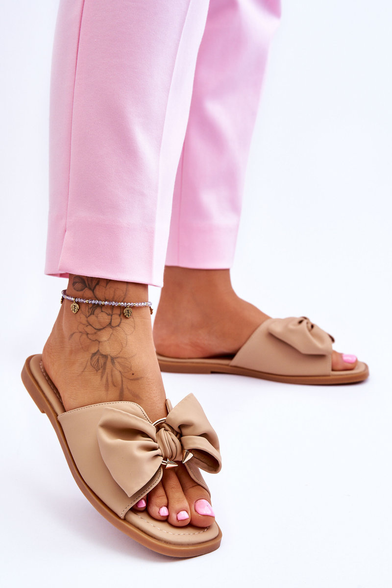 Women's slippers with a classic cut. Made of eco leather. A fashionable bow with a decoration on the front makes the flip-flops look amazing! The soft insole is comfortable to use and is also made of eco leather. Open toe, square. The flip flops were set on a flat heel. Fashionable and comfortable to use - you just have to have them. When choosing a size, please refer to the size chart.